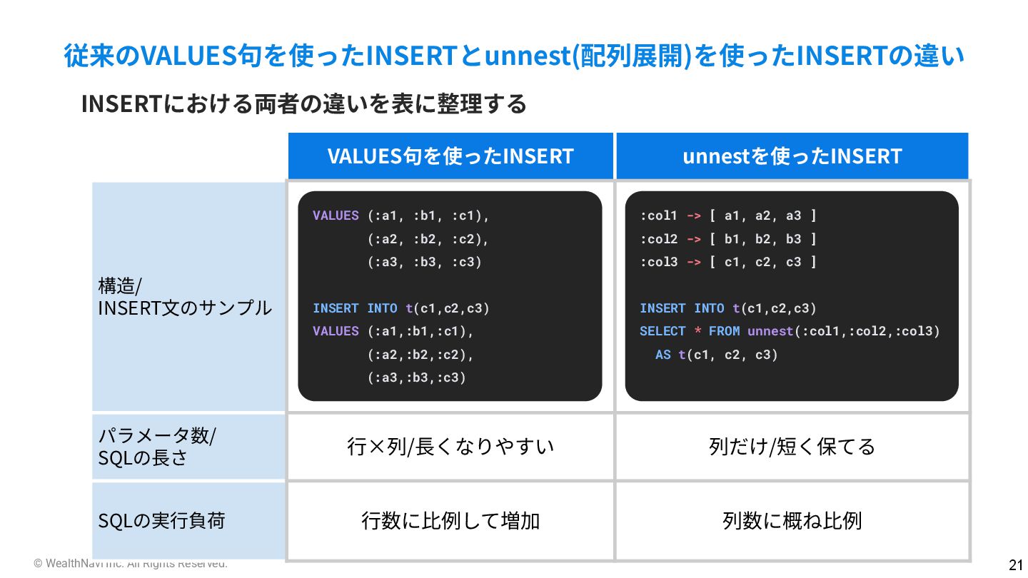 16. © WealthNavi Inc. All Rights Reserved. 21 従来のVALUES句を使ったINSERTとunnest(配列展開)を使ったINSERTの違い INSERTにおける両者の違いを表に整理する VALUES句を使ったINSERT