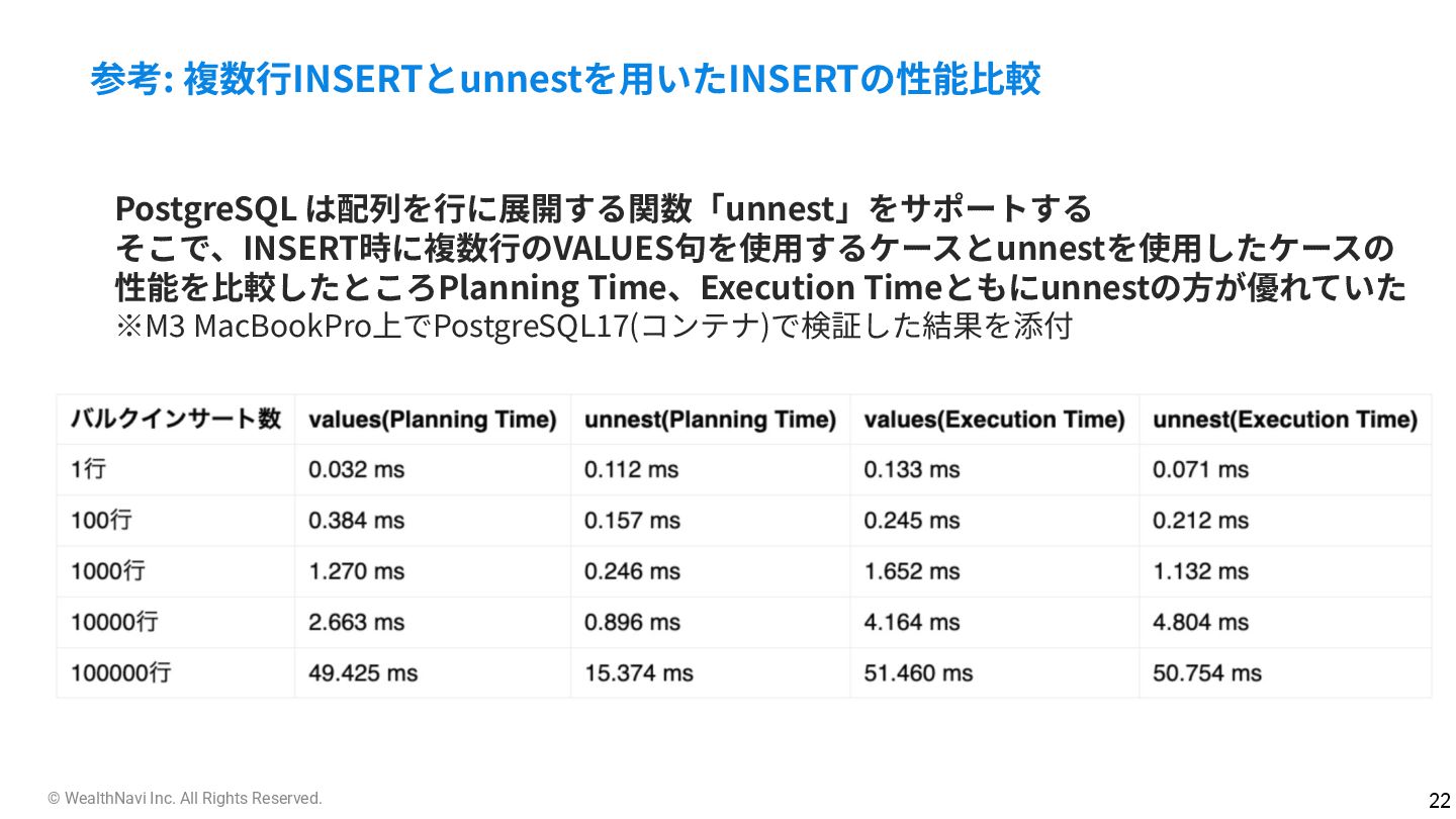 17. © WealthNavi Inc. All Rights Reserved. 参考: 複数⾏INSERTとunnestを⽤いたINSERTの性能⽐較 PostgreSQL は配列を⾏に展開する関数「unnest」をサポートする