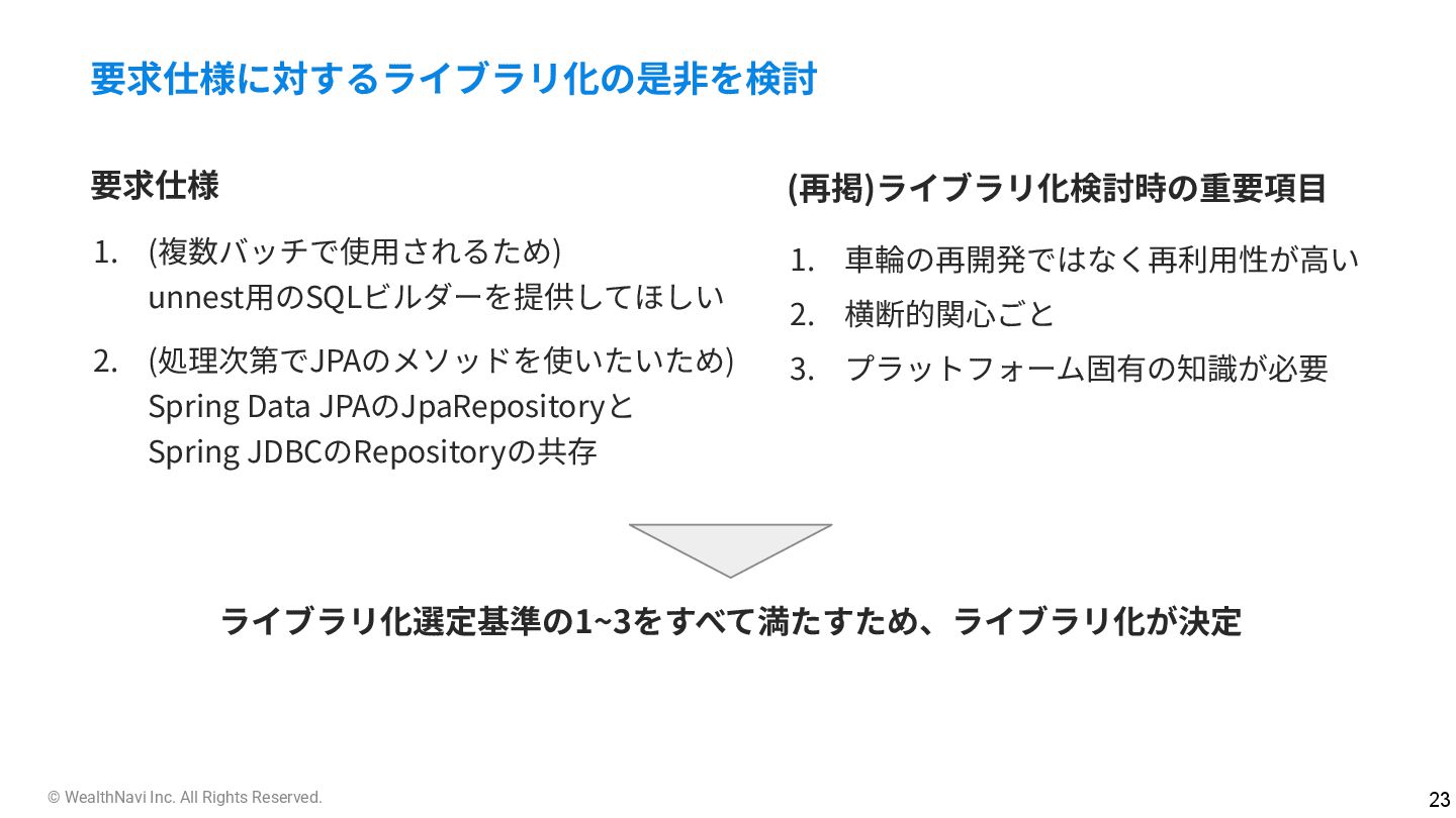 横断的関⼼ごと 3. プラットフォーム固有の知識が必要 (再掲)ライブラリ化検討時の重要項⽬ 1. (複数バッチで使⽤されるため) unnest⽤のSQLビルダーを提供してほしい 2. (処理次第でJPAのメソッドを使いたいため) Spring Data JPAのJpaRepositoryと Spring JDBCのRepositoryの共存 要求仕様 要求仕様に対するライブラリ化の是⾮を検討 ライブラリ化選定基準の1~3をすべて満たすため、ライブラリ化が決定