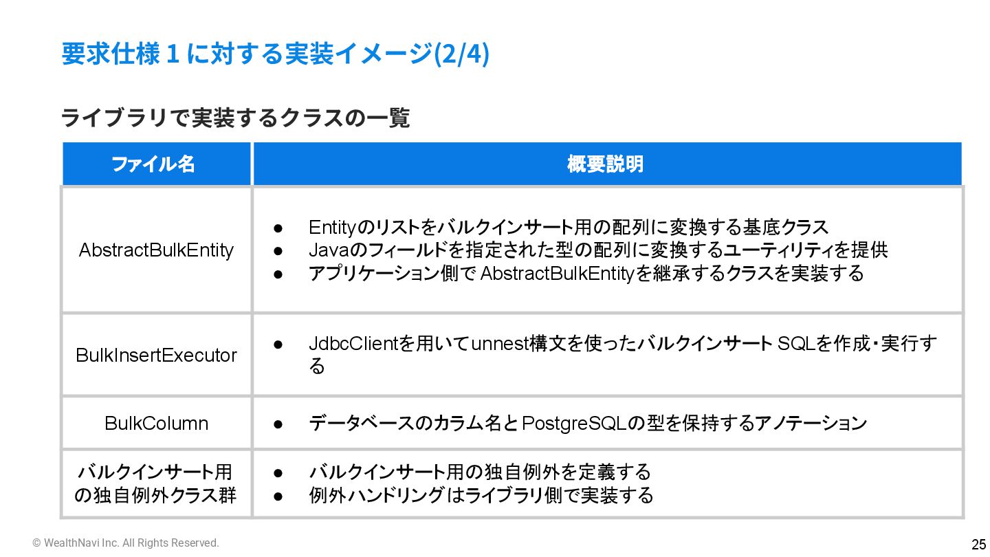 ファイル名 概要説明 AbstractBulkEntity • Entityのリストをバルクインサート用の配列に変換する基底クラス • Javaのフィールドを指定された型の配列に変換するユーティリティを提供 • アプリケーション側で AbstractBulkEntityを継承するクラスを実装する BulkInsertExecutor • JdbcClientを用いてunnest構文を使ったバルクインサート SQLを作成・実行す る BulkColumn • データベースのカラム名と PostgreSQLの型を保持するアノテーション バルクインサート用 の独自例外クラス群 • バルクインサート用の独自例外を定義する • 例外ハンドリングはライブラリ側で実装する ライブラリで実装するクラスの⼀覧