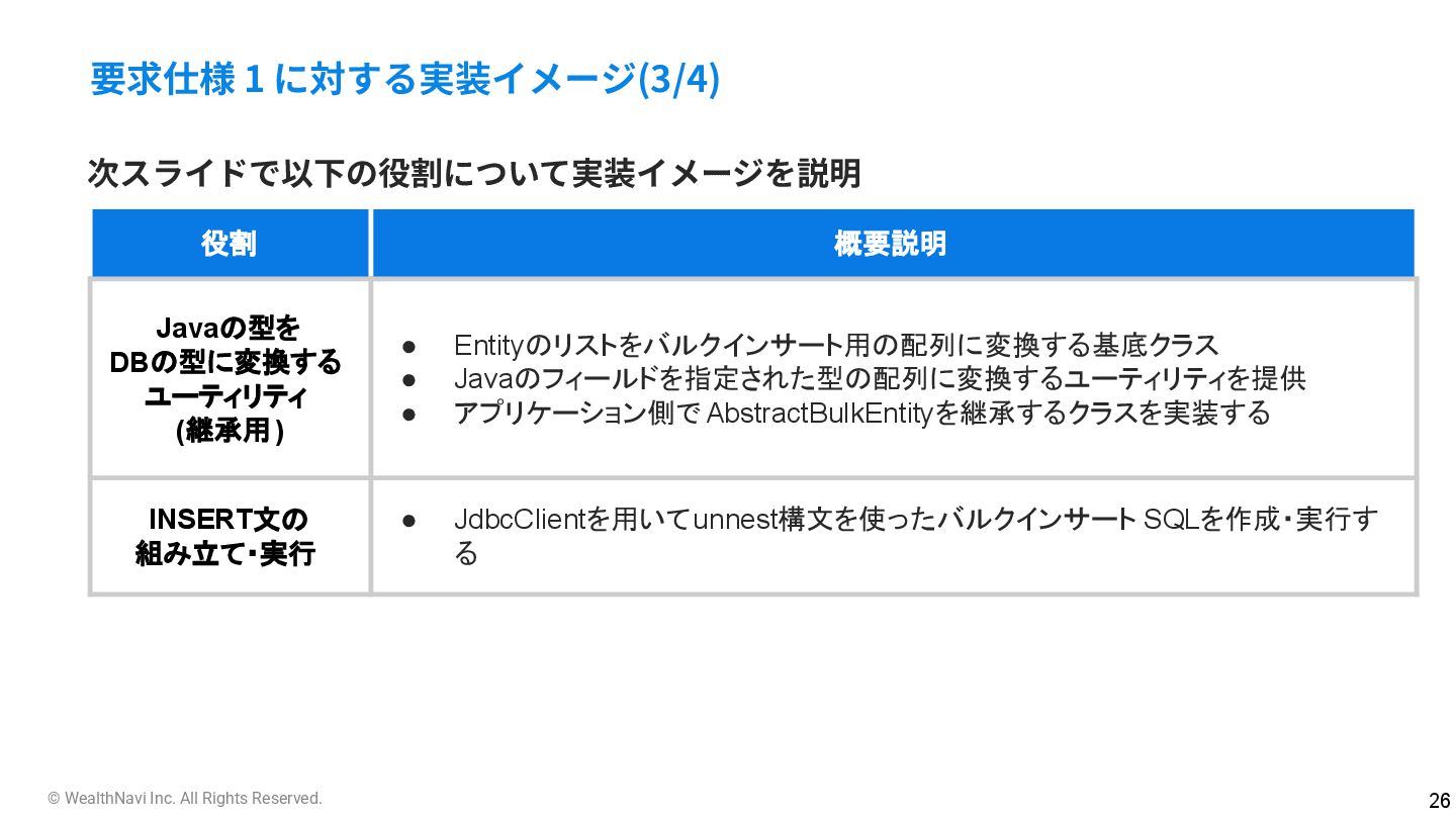役割 概要説明 Javaの型を DBの型に変換する ユーティリティ (継承用) • Entityのリストをバルクインサート用の配列に変換する基底クラス • Javaのフィールドを指定された型の配列に変換するユーティリティを提供 • アプリケーション側で AbstractBulkEntityを継承するクラスを実装する INSERT文の 組み立て・実行 • JdbcClientを用いてunnest構文を使ったバルクインサート SQLを作成・実行す る 次スライドで以下の役割について実装イメージを説明