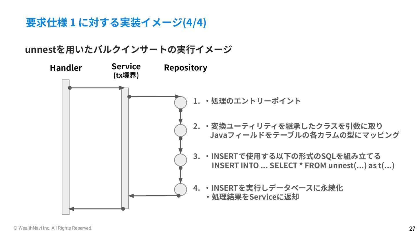 1. ‧処理のエントリーポイント 2. ‧変換ユーティリティを継承したクラスを引数に取り    Javaフィールドをテーブルの各カラムの型にマッピング 3. ‧INSERTで使⽤する以下の形式のSQLを組み⽴てる    INSERT INTO ... SELECT * FROM unnest(...) as t(...) 4. ‧INSERTを実⾏しデータベースに永続化   ‧処理結果をServiceに返却 Service (tx境界) Repository Handler 27