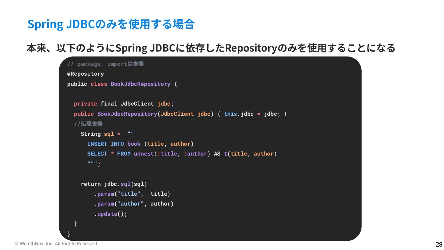 package, importは省略 @Repository public class BookJdbcRepository { private final JdbcClient jdbc; public BookJdbcRepository(JdbcClient jdbc) { this.jdbc = jdbc; } //処理省略 String sql = """  INSERT INTO book (title, author) SELECT * FROM unnest(:title, :author) AS t(title, author) """; return jdbc.sql(sql) .param("title", title) .param("author", author) .update(); } } 本来、以下のようにSpring JDBCに依存したRepositoryのみを使⽤することになる