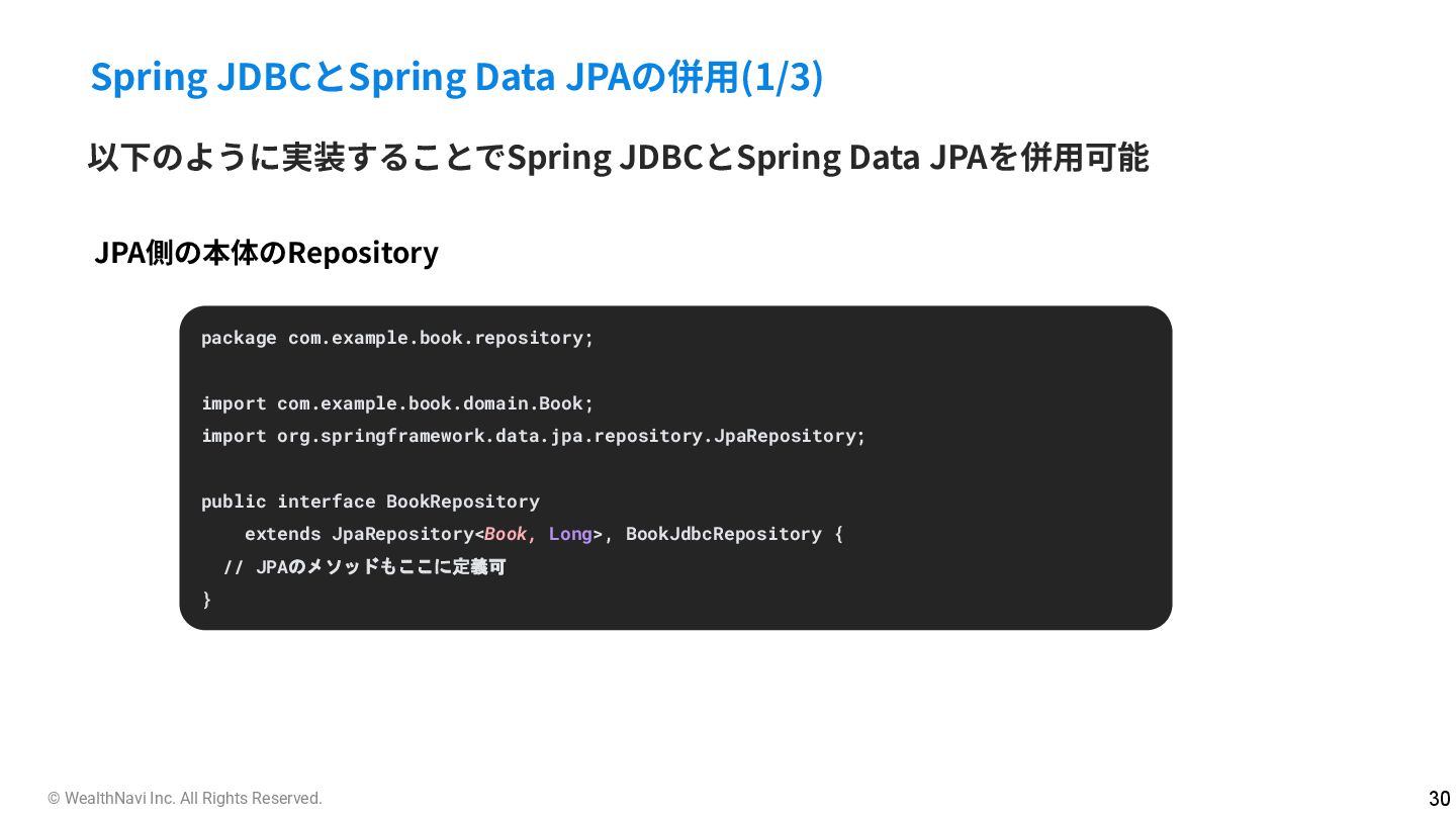 JPAの併⽤(1/3) package com.example.book.repository; import com.example.book.domain.Book; import org.springframework.data.jpa.repository.JpaRepository; public interface BookRepository extends JpaRepository<Book, Long>, BookJdbcRepository { // JPAのメソッドもここに定義可 } 以下のように実装することでSpring JDBCとSpring Data JPAを併⽤可能 JPA側の本体のRepository