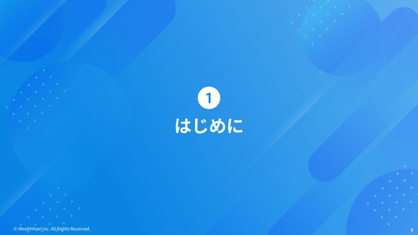 • 本資料には将来の出来事に関する予想が含まれている場合がありますが、それらは予想であり、また、本資料の内容の 正確性、信頼性、完全性、適時性等を一切保証するものではありません。本資料に基づいて被ったいかなる損害について も、当社は一切の責任を負いません。また、当社は、新しい情報や将来の出来事その他の情報について、更新又は訂正 する義務を負いません。 • 本資料を利用することによりお客様に生じた直接的損害、間接的損害、派生的損害その他いかなる損害についても、当社 は一切の責任を負いません。 商号等:ウェルスナビ株式会社 金融商品取引業者 関東財務局長(金商) 第2884号 加入協会:日本証券業協会 一般社団法人日本投資顧問業協会 重要な注意事項