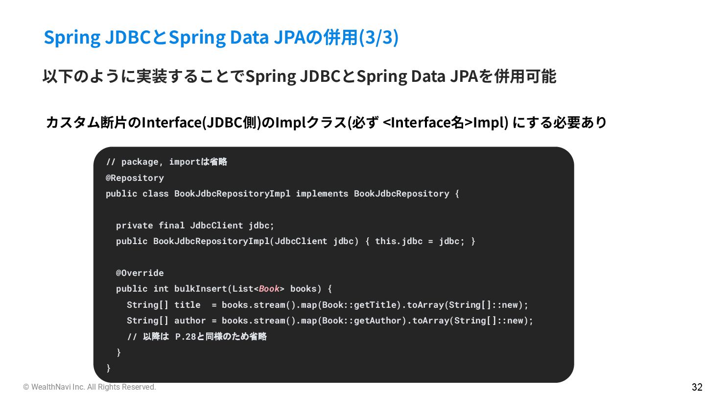 JPAの併⽤(2/3) package com.example.book.repository; import com.example.book.domain.Book; import java.util.List; public interface BookJdbcRepository { int bulkInsert(List<Book> books); } カスタム断⽚のInterface(JDBC側) 以下のように実装することでSpring JDBCとSpring Data JPAを併⽤可能