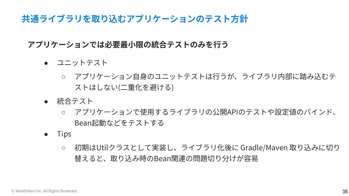 29. © WealthNavi Inc. All Rights Reserved. 35 共通ライブラリを取り込むアプリケーションのテスト⽅針 アプリケーションでは必要最⼩限の統合テストのみを⾏う •