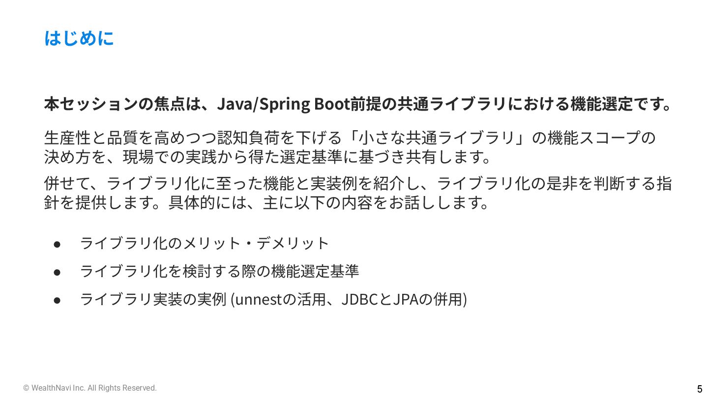 ライブラリ化を検討する際の機能選定基準 • ライブラリ実装の実例 (unnestの活⽤、JDBCとJPAの併⽤) 本セッションの焦点は、Java/Spring Boot前提の共通ライブラリにおける機能選定です。 ⽣産性と品質を⾼めつつ認知負荷を下げる「⼩さな共通ライブラリ」の機能スコープの 決め⽅を、現場での実践から得た選定基準に基づき共有します。 併せて、ライブラリ化に⾄った機能と実装例を紹介し、ライブラリ化の是⾮を判断する 指針を提供します。具体的には、主に以下の内容をお話しします。 はじめに