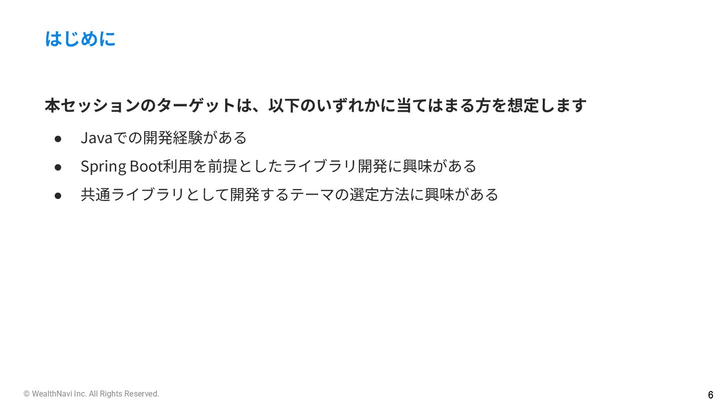Spring Boot利⽤を前提としたライブラリ開発に興味がある • 共通ライブラリとして開発するテーマの選定⽅法に興味がある 本セッションのターゲットは、以下のいずれかに当てはまる⽅を想定します はじめに