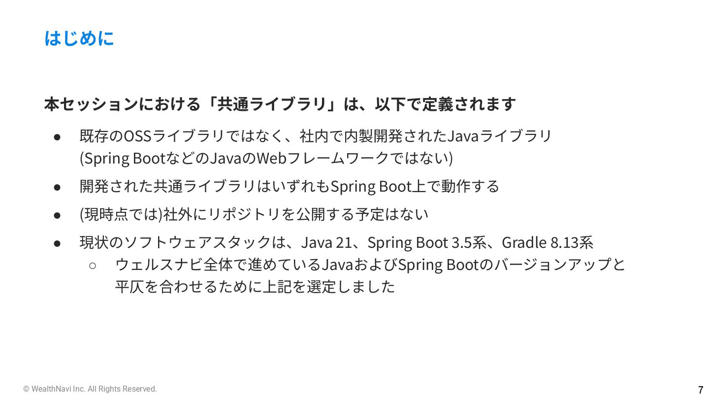 BootなどのJavaのWebフレームワークではない) • 開発された共通ライブラリはいずれもSpring Boot上で動作する • (現時点では)社外にリポジトリを公開する予定はない • 現状のソフトウェアスタックは、Java 21、Spring Boot 3.5系、Gradle 8.13系 ◦ ウェルスナビ全体で進めているJavaおよびSpring Bootのバージョンアップと 平仄を合わせるために上記を選定しました 本セッションにおける「共通ライブラリ」は、以下で定義されます はじめに