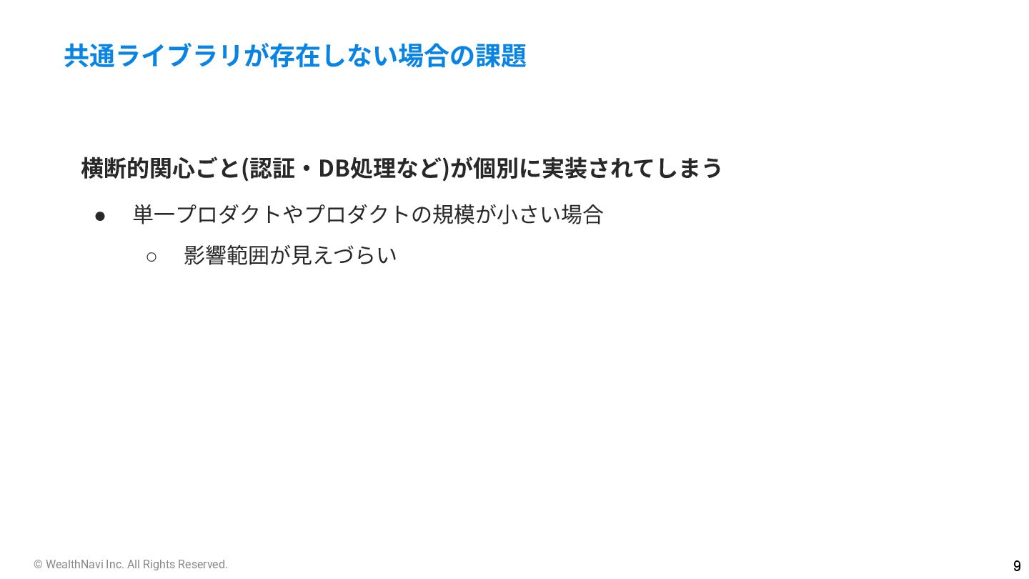 5. © WealthNavi Inc. All Rights Reserved. 9 共通ライブラリが存在しない場合の課題 • 単⼀プロダクトやプロダクトの規模が⼩さい場合
