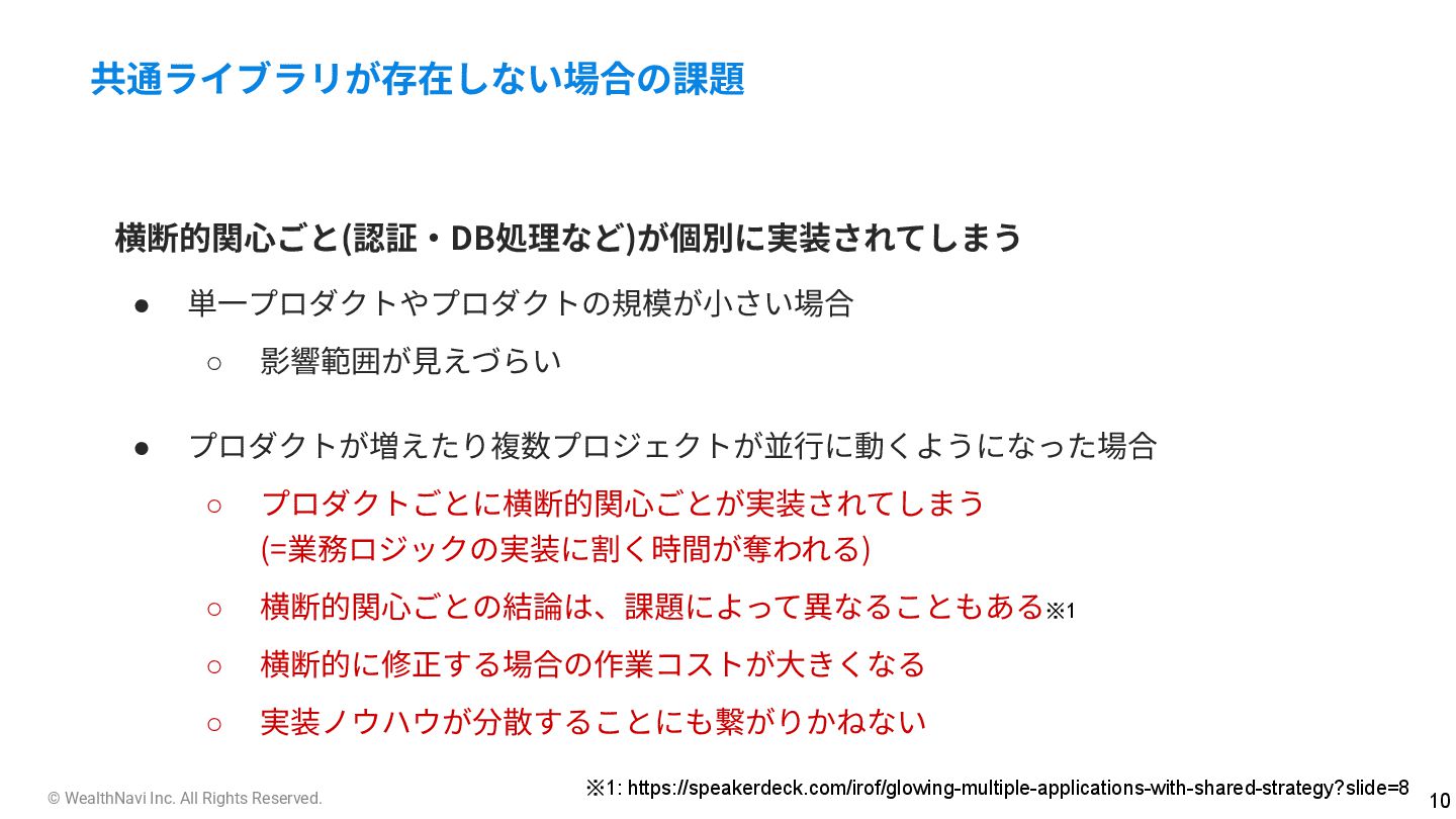 6. © WealthNavi Inc. All Rights Reserved. 10 共通ライブラリが存在しない場合の課題 • 単⼀プロダクトやプロダクトの規模が⼩さい場合