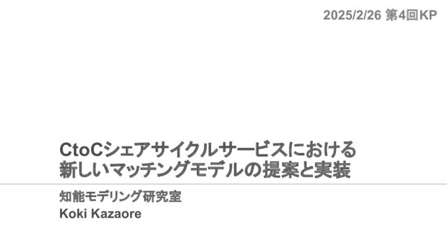 CtoCシェアサイクルサービスにおける 新しいマッチングモデルの提案と実装 知能モデリング研究室 Koki Kazaore 2025/2/26 第4回KP