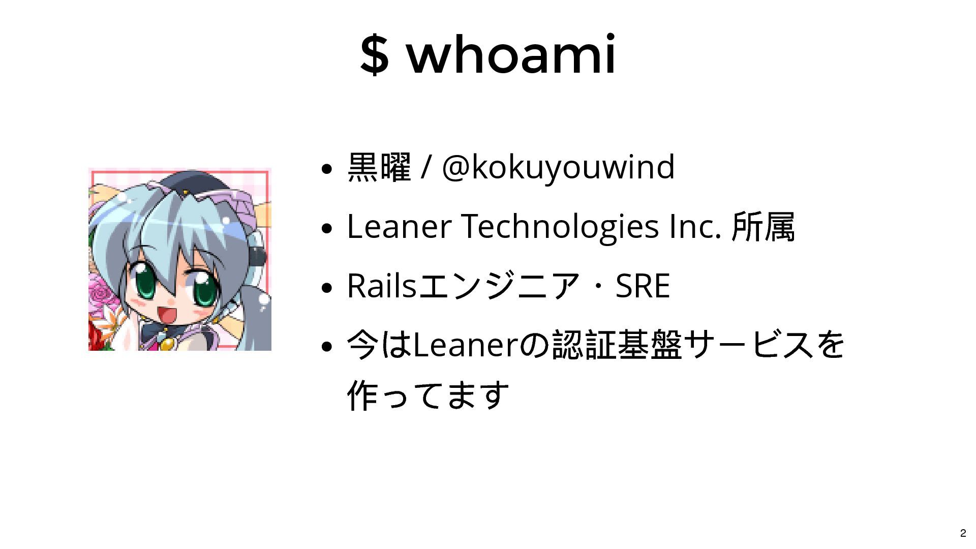 $ whoami 黒曜 / @kokuyouwind Leaner Technologies Inc. 所属 Rails