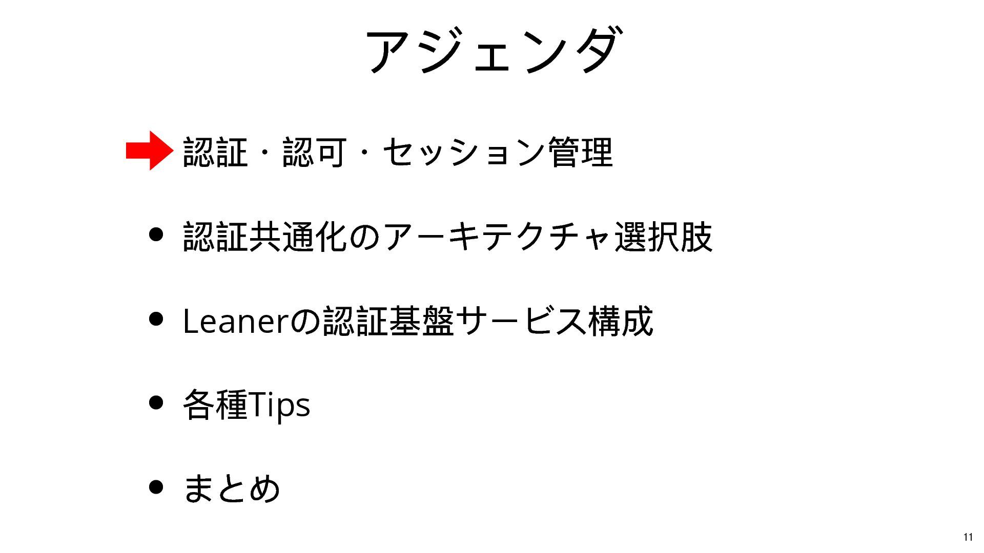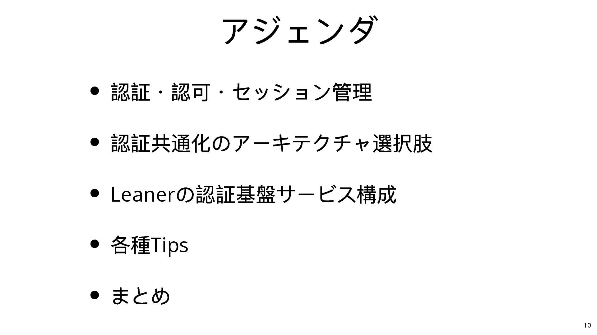 アジェンダ 認証・認可・セッション管理 認証共通化のアーキテクチャ選択肢 Leaner の認証基盤サービス構成 各種Tips まとめ 10