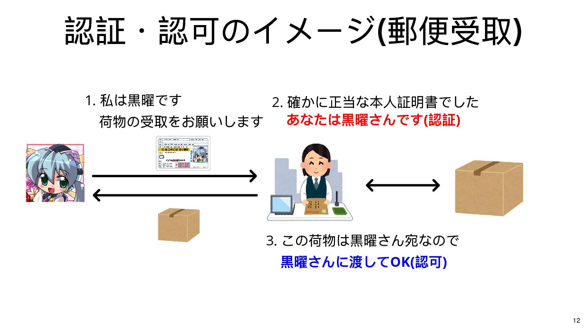 認証・認可のイメージ( 郵便受取) 1. 私は黒曜です 荷物の受取をお願いします 2. 確かに正当な本⼈証明書でした あなたは黒曜さんです( 認証) 3.
