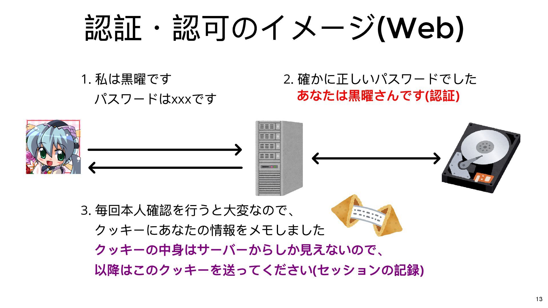 毎回本⼈確認を⾏うと⼤変なので、 クッキーにあなたの情報をメモしました クッキーの中身はサーバーからしか⾒えないので、 以降はこのクッキーを送ってください( セッションの記録) 13