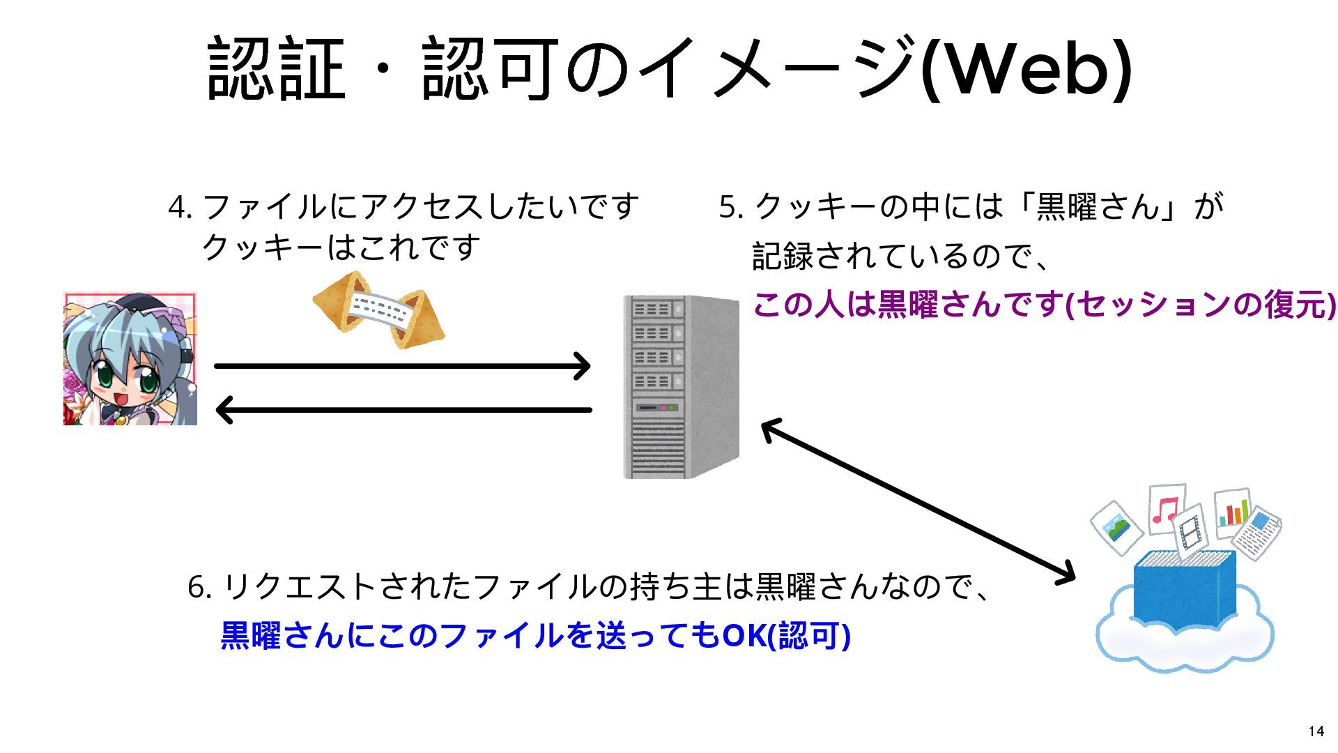 認証・認可のイメージ(Web) 4. ファイルにアクセスしたいです クッキーはこれです 5. クッキーの中には「黒曜さん」が 記録されているので、 この⼈は黒曜さんです( セッションの復元) 6.