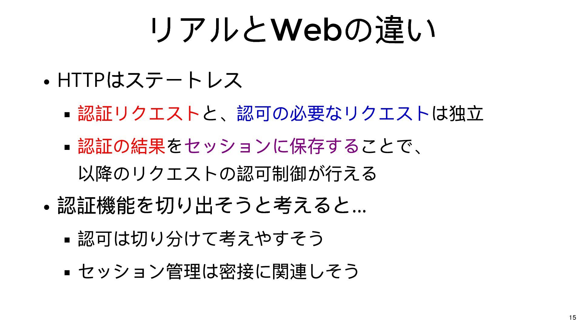 リアルとWeb の違い HTTP はステートレス 認証リクエストと、認可の必要なリクエストは独⽴ 認証の結果をセッションに保存することで、 以降のリクエストの認可制御が⾏える 認証機能を切り出そうと考えると… 認可は切り分けて考えやすそう セッション管理は密接に関連しそう