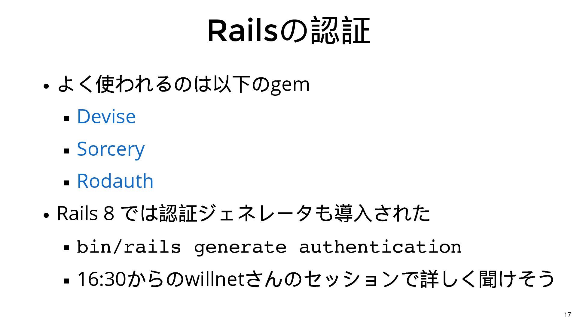 からのwillnet さんのセッションで詳しく聞けそう Devise Sorcery Rodauth 17
