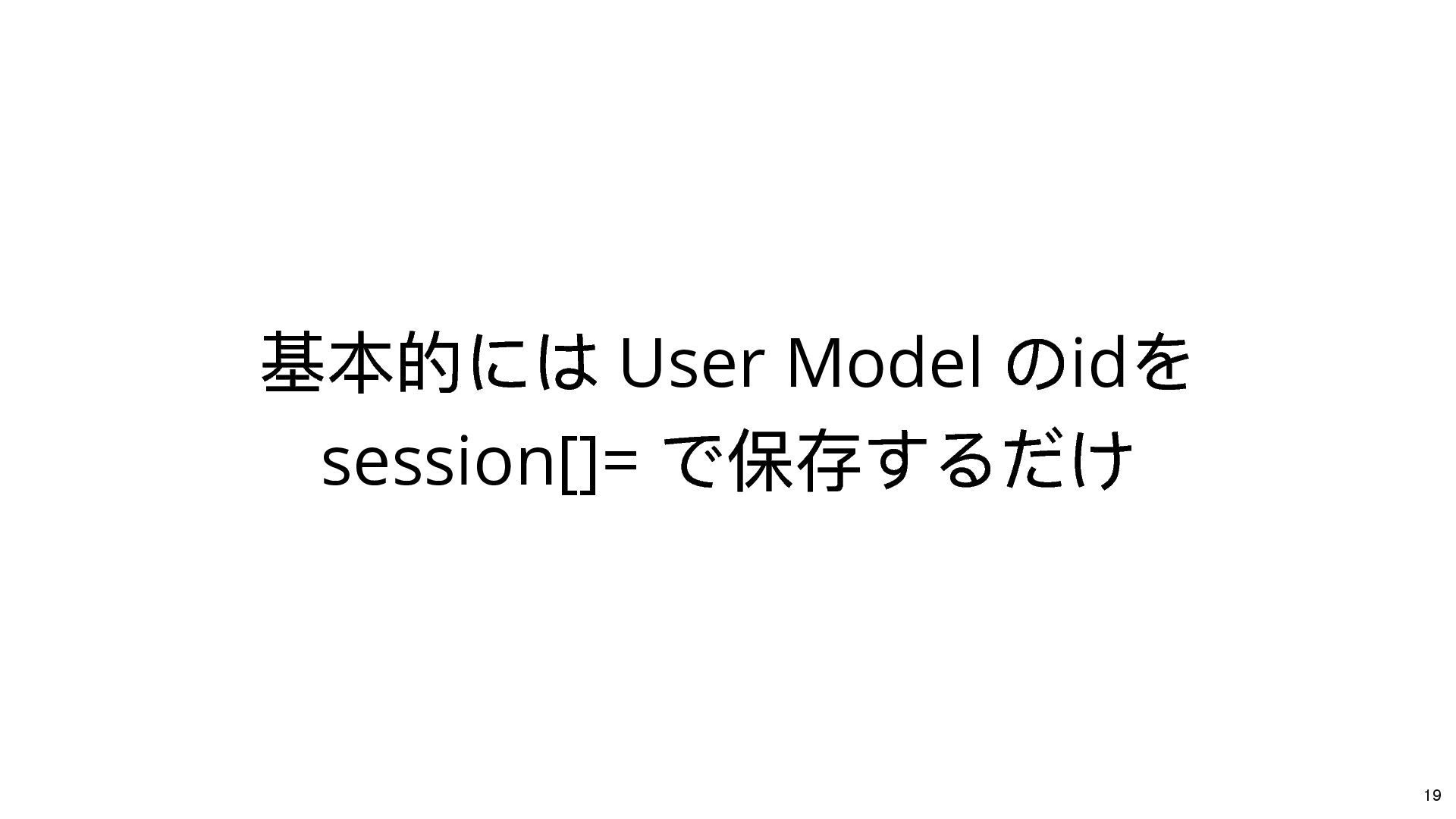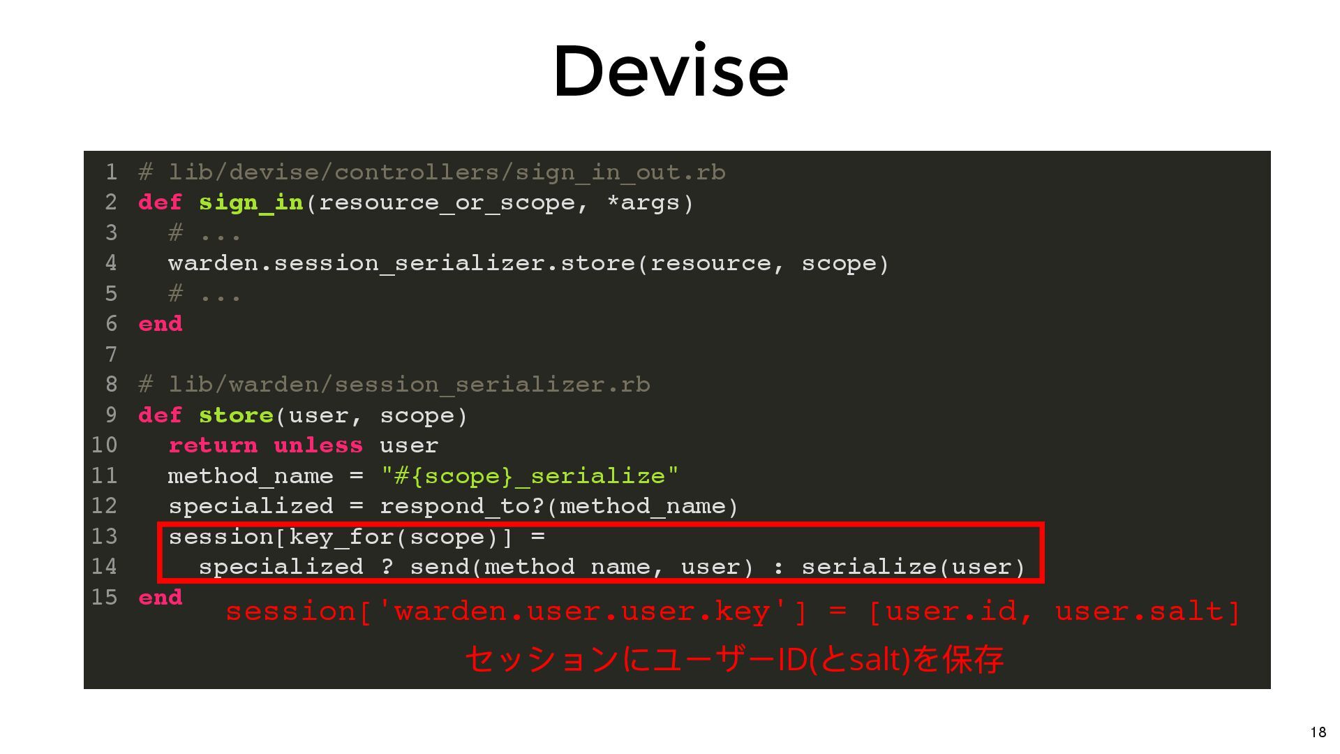 # ... end # lib/warden/session_serializer.rb def store(user, scope) return unless user method_name = "#{scope}_serialize" specialized = respond_to?(method_name) session[key_for(scope)] = specialized ? send(method_name, user) : serialize(user) end 1 2 3 4 5 6 7 8 9 10 11 12 13 14 15 session['warden.user.user.key'] = [user.id, user.salt] セッションにユーザーID( とsalt) を保存 18