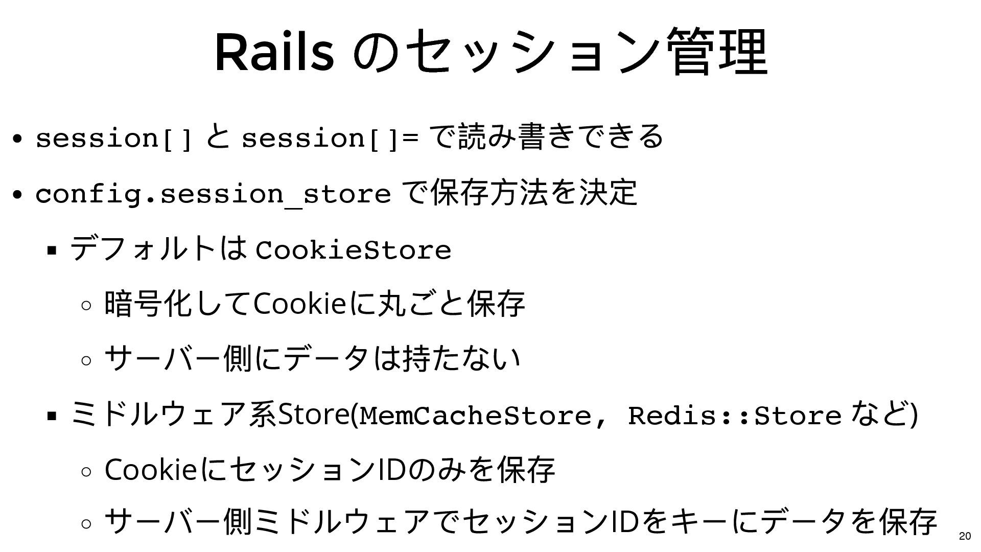 暗号化してCookie に丸ごと保存 サーバー側にデータは持たない ミドルウェア系Store(MemCacheStore, Redis::Store など) Cookie にセッションID のみを保存 サーバー側ミドルウェアでセッションID をキーにデータを保存 20