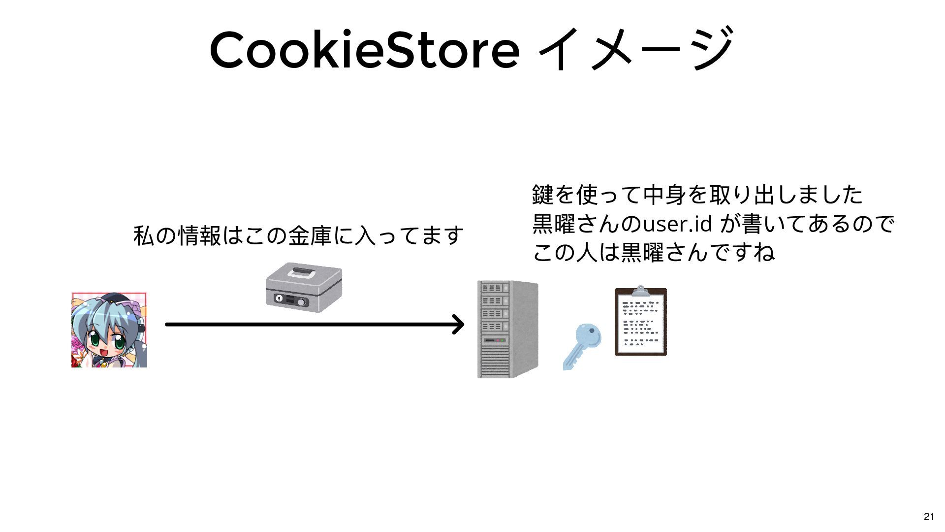 CookieStore イメージ 私の情報はこの⾦庫に⼊ってます 鍵を使って中身を取り出しました 黒曜さんのuser.id が書いてあるので この⼈は黒曜さんですね 21