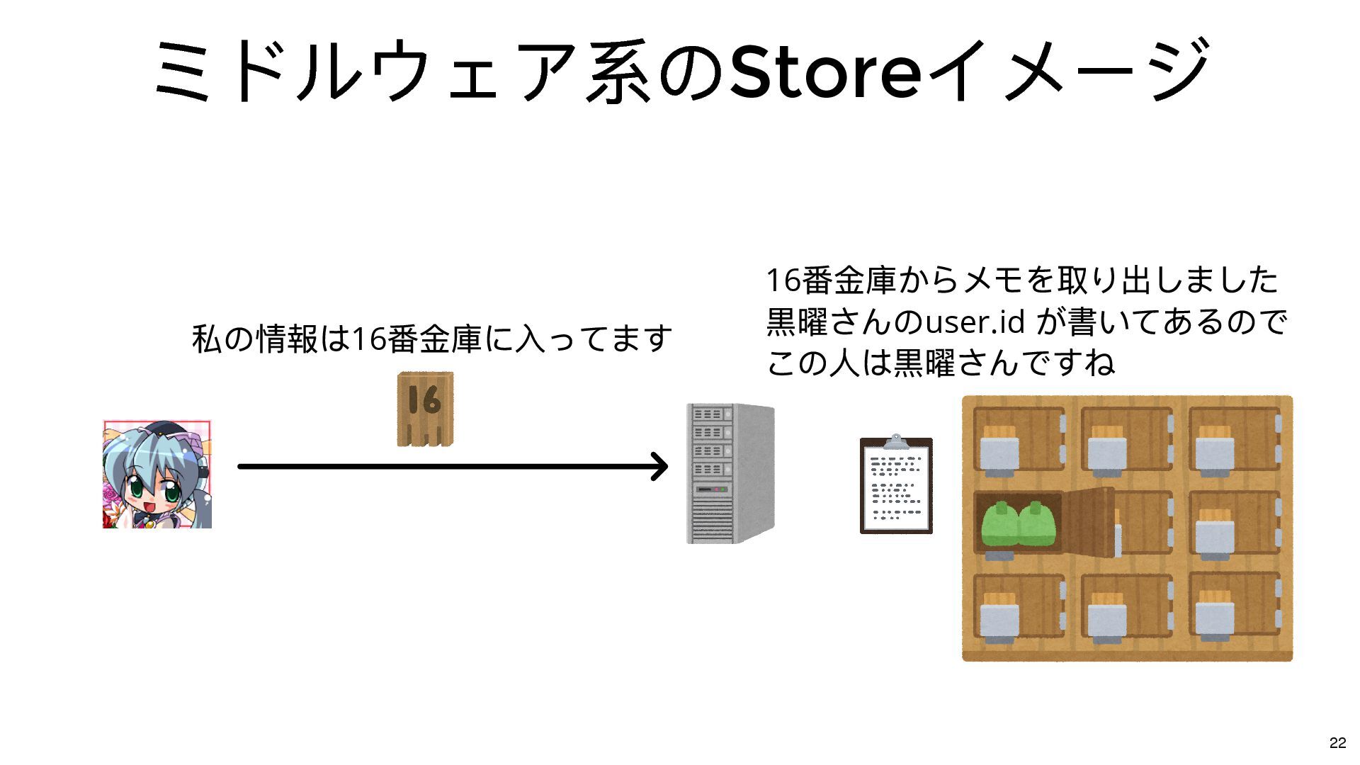ミドルウェア系のStore イメージ 私の情報は16 番⾦庫に⼊ってます 16 番⾦庫からメモを取り出しました 黒曜さんのuser.id が書いてあるので この⼈は黒曜さんですね 22