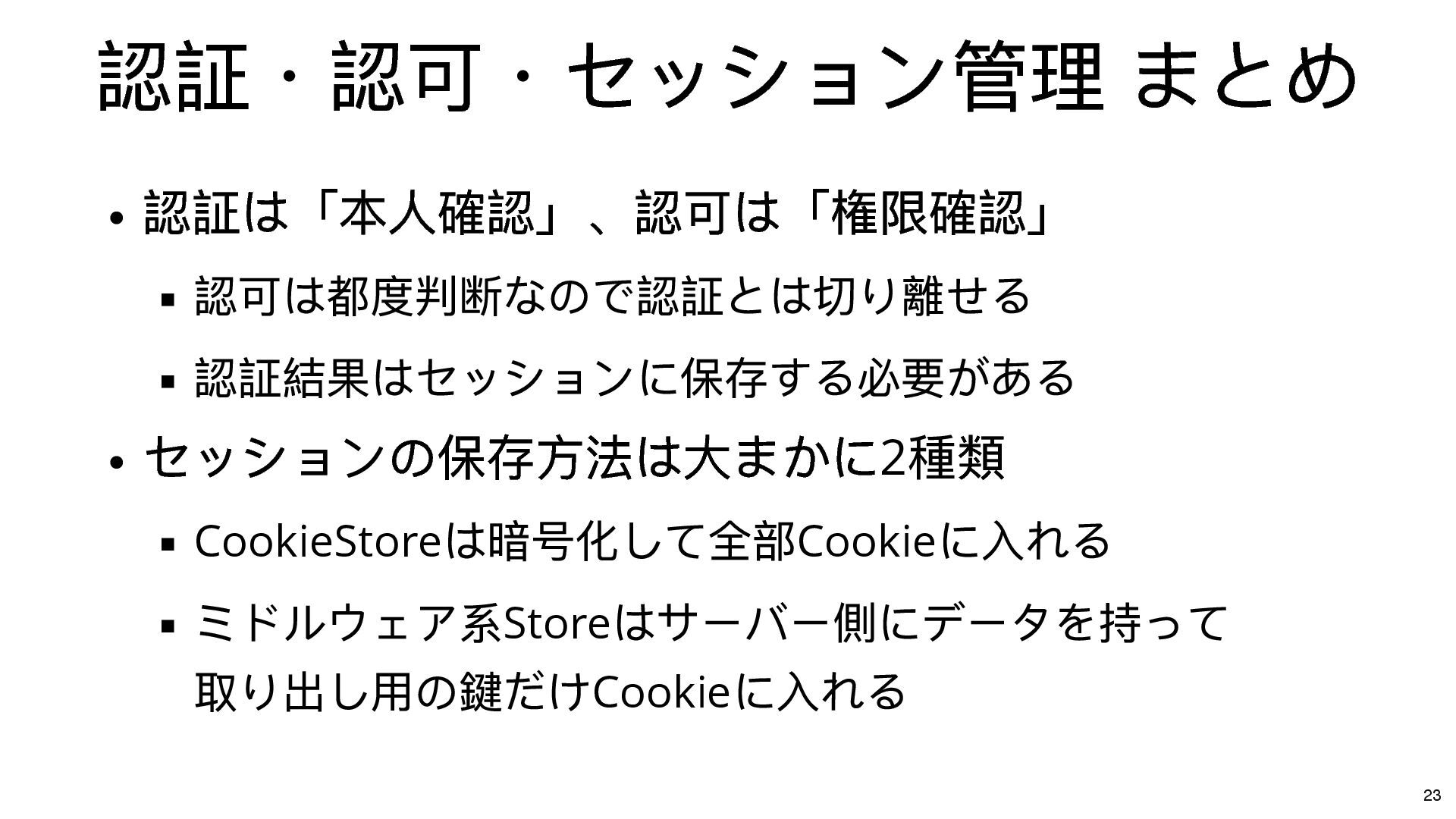 認証・認可・セッション管理 まとめ 認証は「本⼈確認」、認可は「権限確認」 認可は都度判断なので認証とは切り離せる 認証結果はセッションに保存する必要がある セッションの保存⽅法は⼤まかに2 種類 CookieStore は暗号化して全部Cookie に⼊れる
