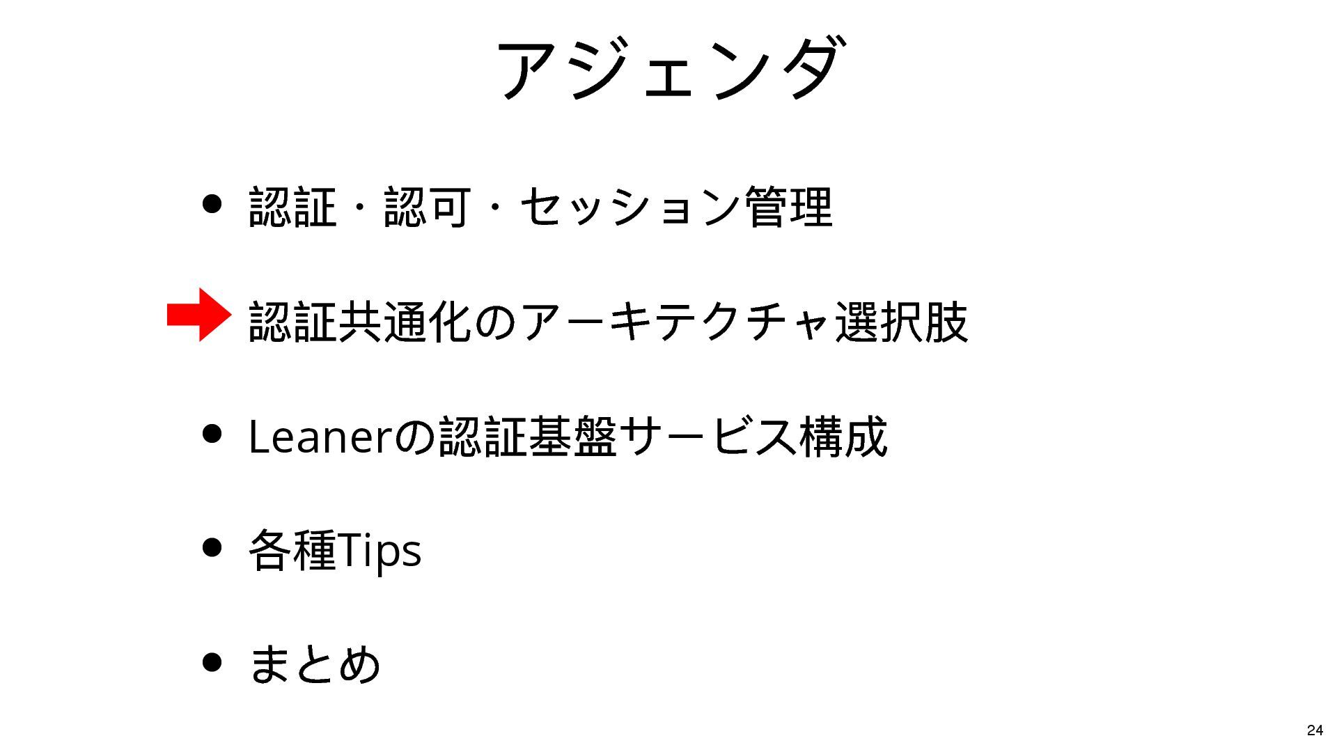 認証・認可・セッション管理 認証共通化のアーキテクチャ選択肢 Leaner の認証基盤サービス構成 各種Tips まとめ アジェンダ 24