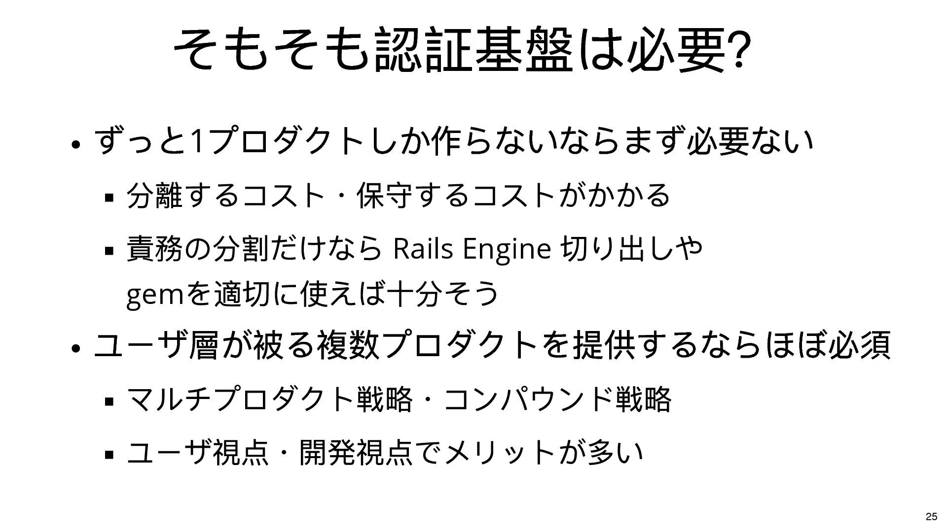 そもそも認証基盤は必要? ずっと1 プロダクトしか作らないならまず必要ない 分離するコスト・保守するコストがかかる 責務の分割だけなら Rails Engine 切り出しや gem を適切に使えば⼗分そう