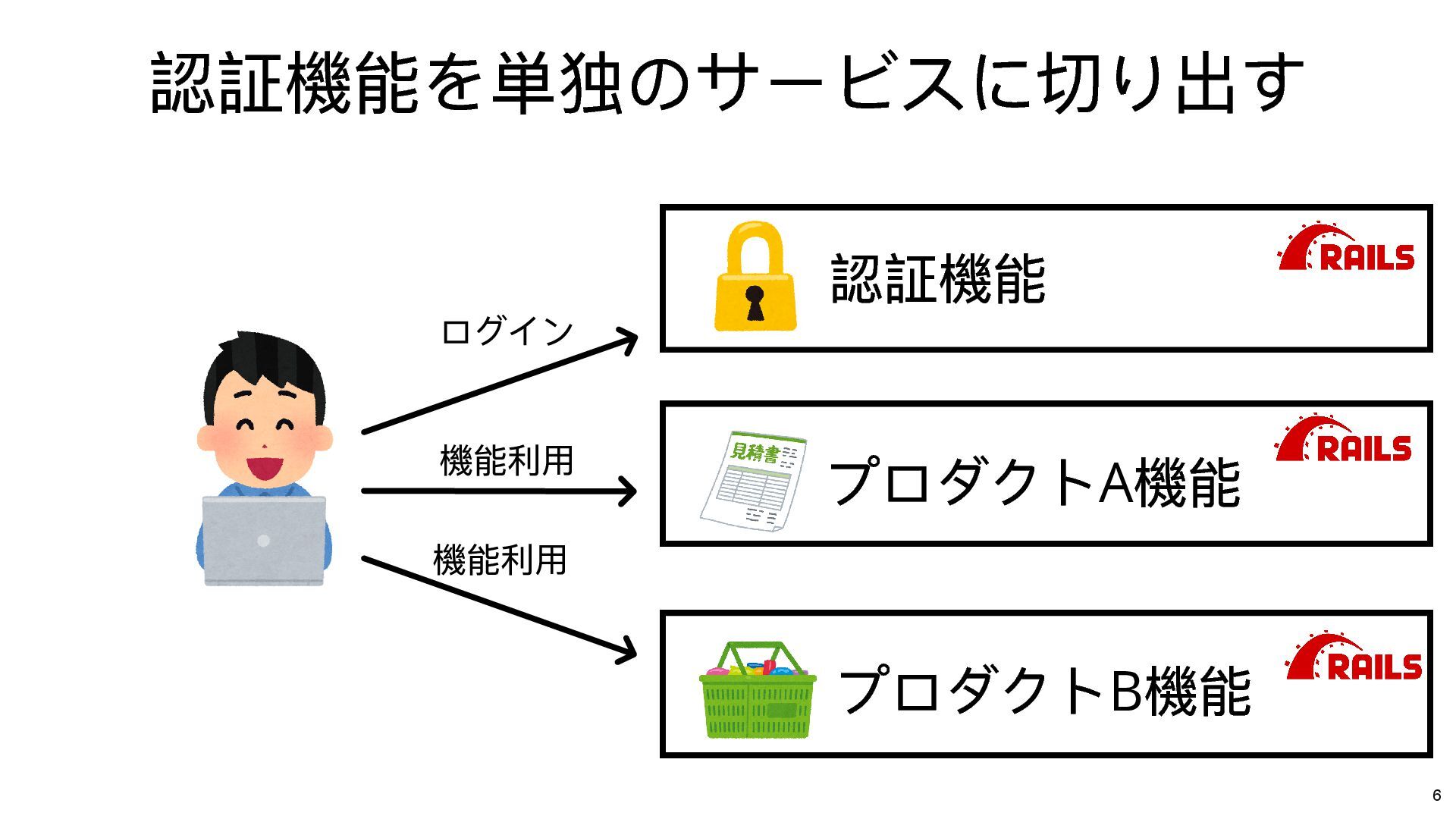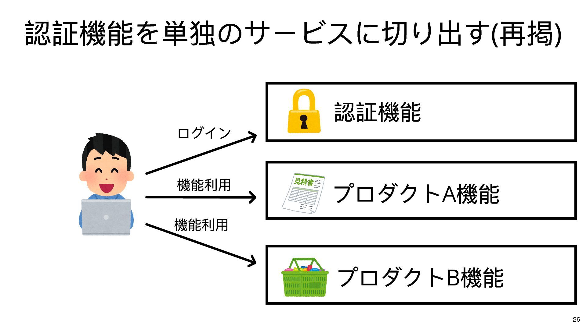 認証機能を単独のサービスに切り出す( 再掲) 認証機能 プロダクトB 機能 ログイン 機能利⽤ 機能利⽤ プロダクトA 機能