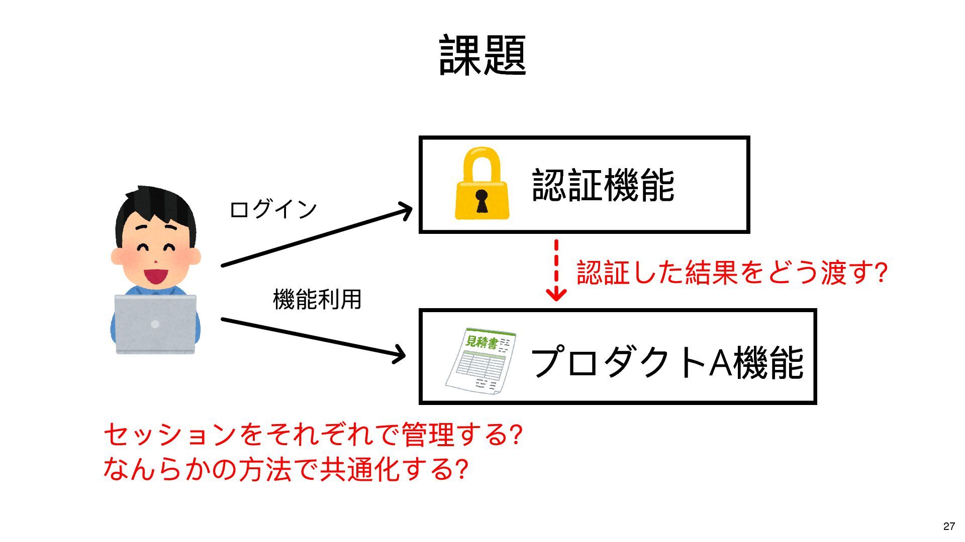 課題 認証機能 ログイン 機能利⽤ プロダクトA 機能 認証した結果をどう渡す? セッションをそれぞれで管理する? なんらかの⽅法で共通化する? 27