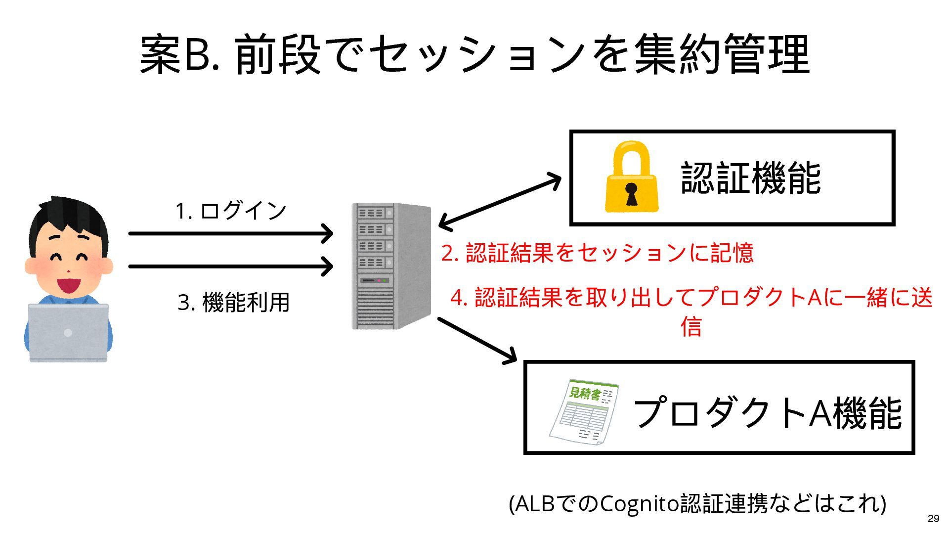 案B. 前段でセッションを集約管理 認証機能 1. ログイン 3. 機能利⽤ プロダクトA 機能 (ALB