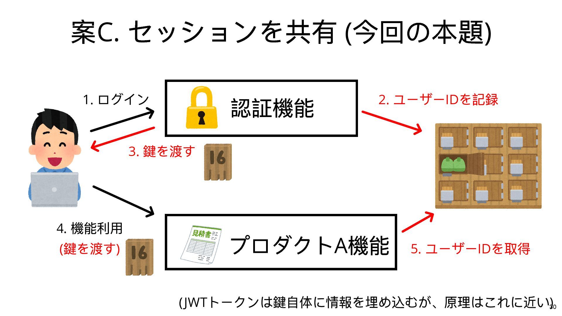 案C. セッションを共有 ( 今回の本題) 認証機能 1. ログイン 4. 機能利⽤ (
