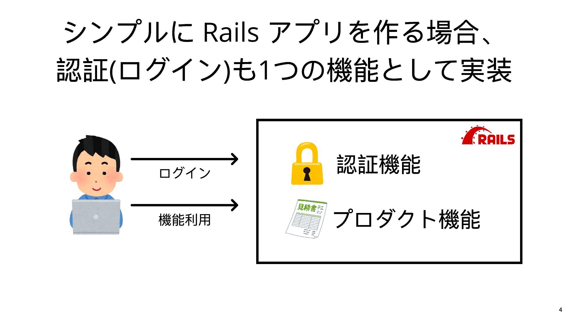 シンプルに Rails アプリを作る場合、 認証( ログイン) も1 つの機能として実装 認証機能 プロダクト機能 ログイン