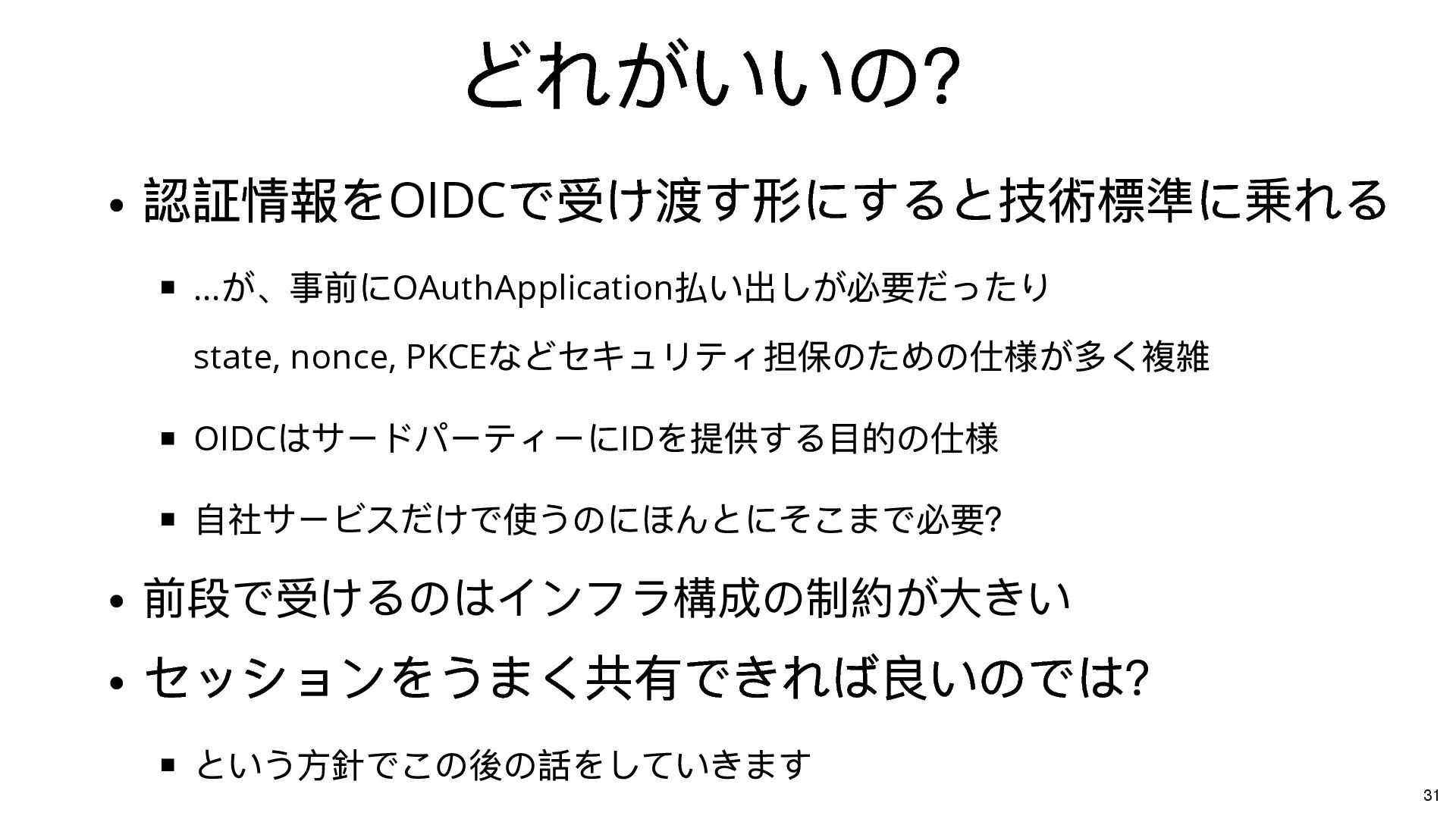 OIDC はサードパーティーにID を提供する⽬的の仕様 ⾃社サービスだけで使うのにほんとにそこまで必要? 前段で受けるのはインフラ構成の制約が⼤きい セッションをうまく共有できれば良いのでは? という⽅針でこの後の話をしていきます 31