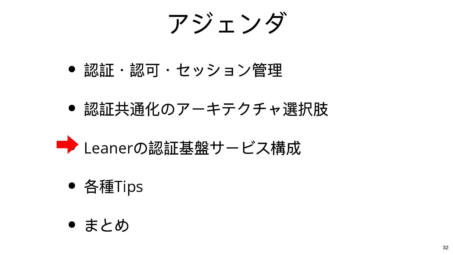 認証・認可・セッション管理 認証共通化のアーキテクチャ選択肢 Leaner の認証基盤サービス構成 各種Tips まとめ アジェンダ 32