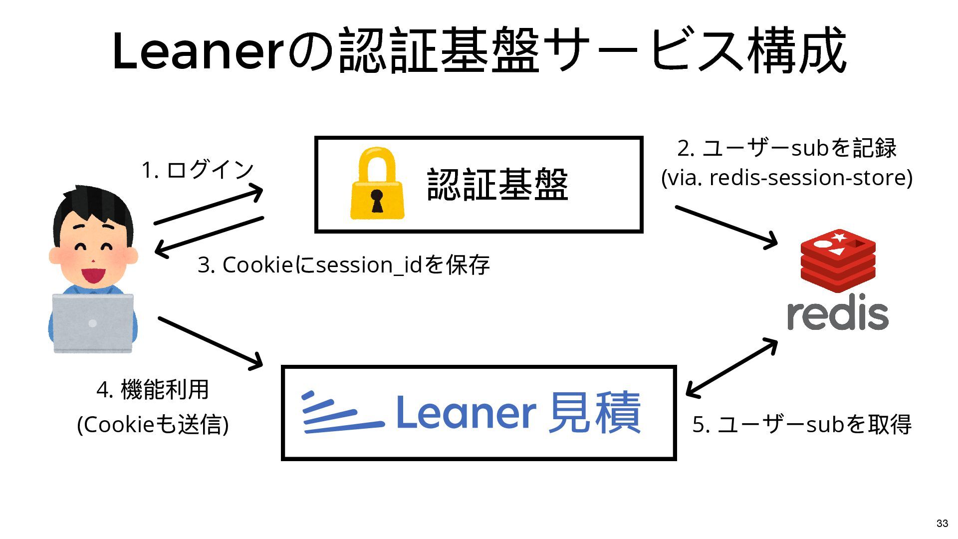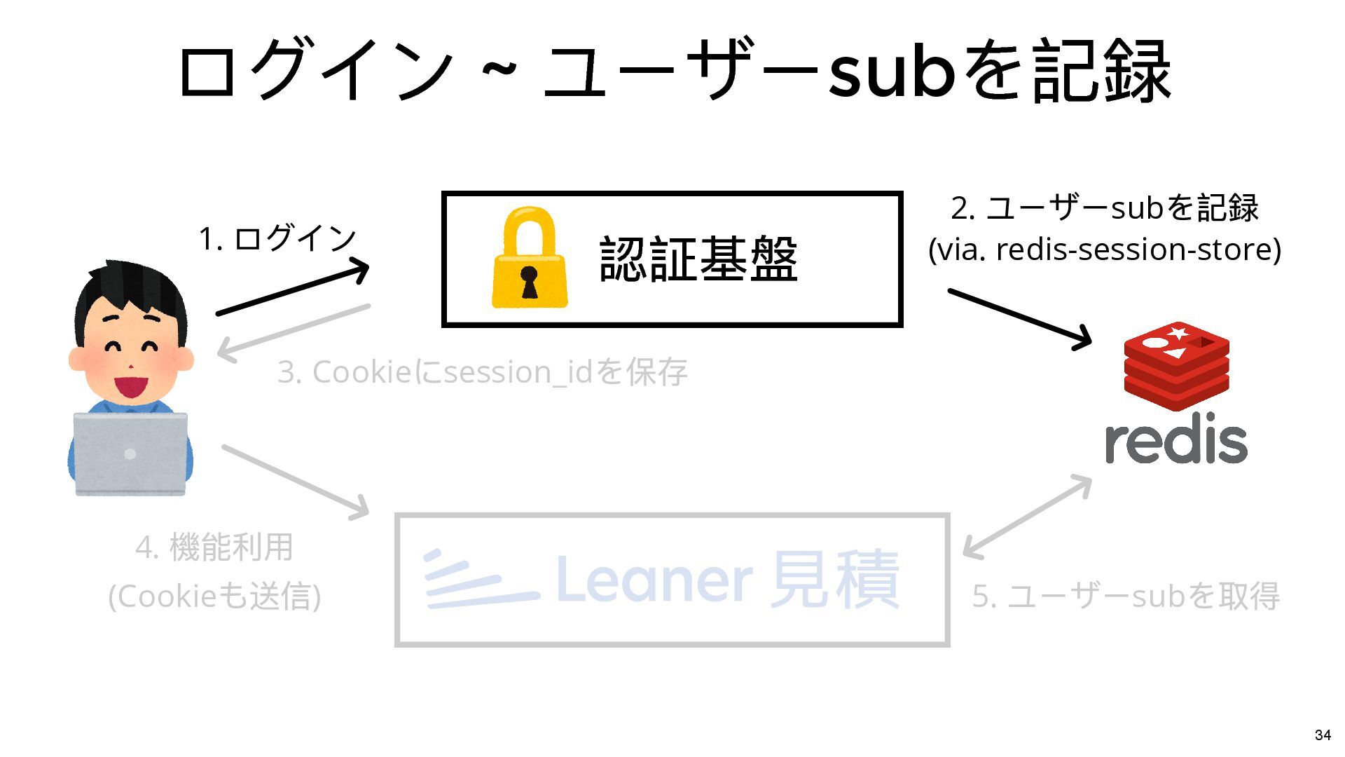 も送信) 2. ユーザーsub を記録 (via. redis-session-store) 3. Cookie にsession_id を保存 5. ユーザーsub を取得 34