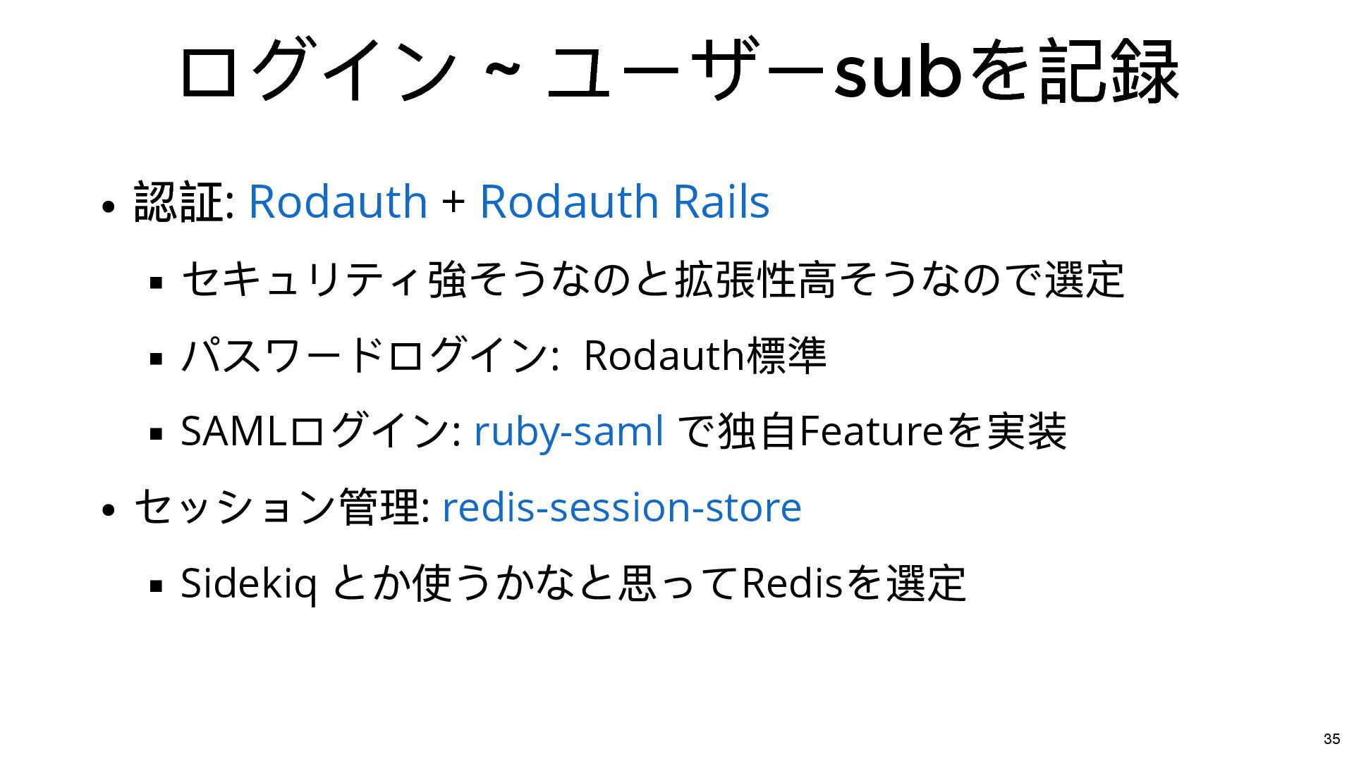 SAML ログイン: で独⾃Feature を実装 セッション管理: Sidekiq とか使うかなと思ってRedis を選定 Rodauth Rodauth Rails ruby-saml redis-session-store 35