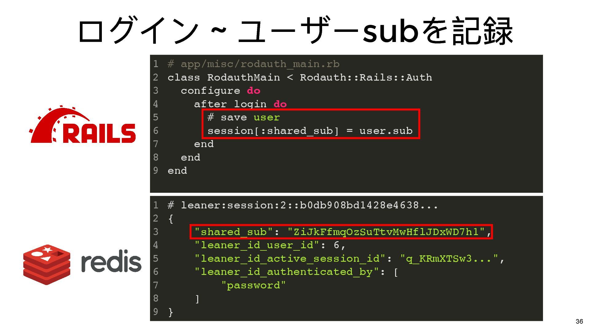 configure do after_login do # save user session[:shared_sub] = user.sub end end end 1 2 3 4 5 6 7 8 9 # leaner:session:2::b0db908bd1428e4638... { "shared_sub": "ZiJkFfmqOzSuTtvMwHflJDxWD7h1", "leaner_id_user_id": 6, "leaner_id_active_session_id": "q_KRmXTSw3...", "leaner_id_authenticated_by": [ "password" ] } 1 2 3 4 5 6 7 8 9 36