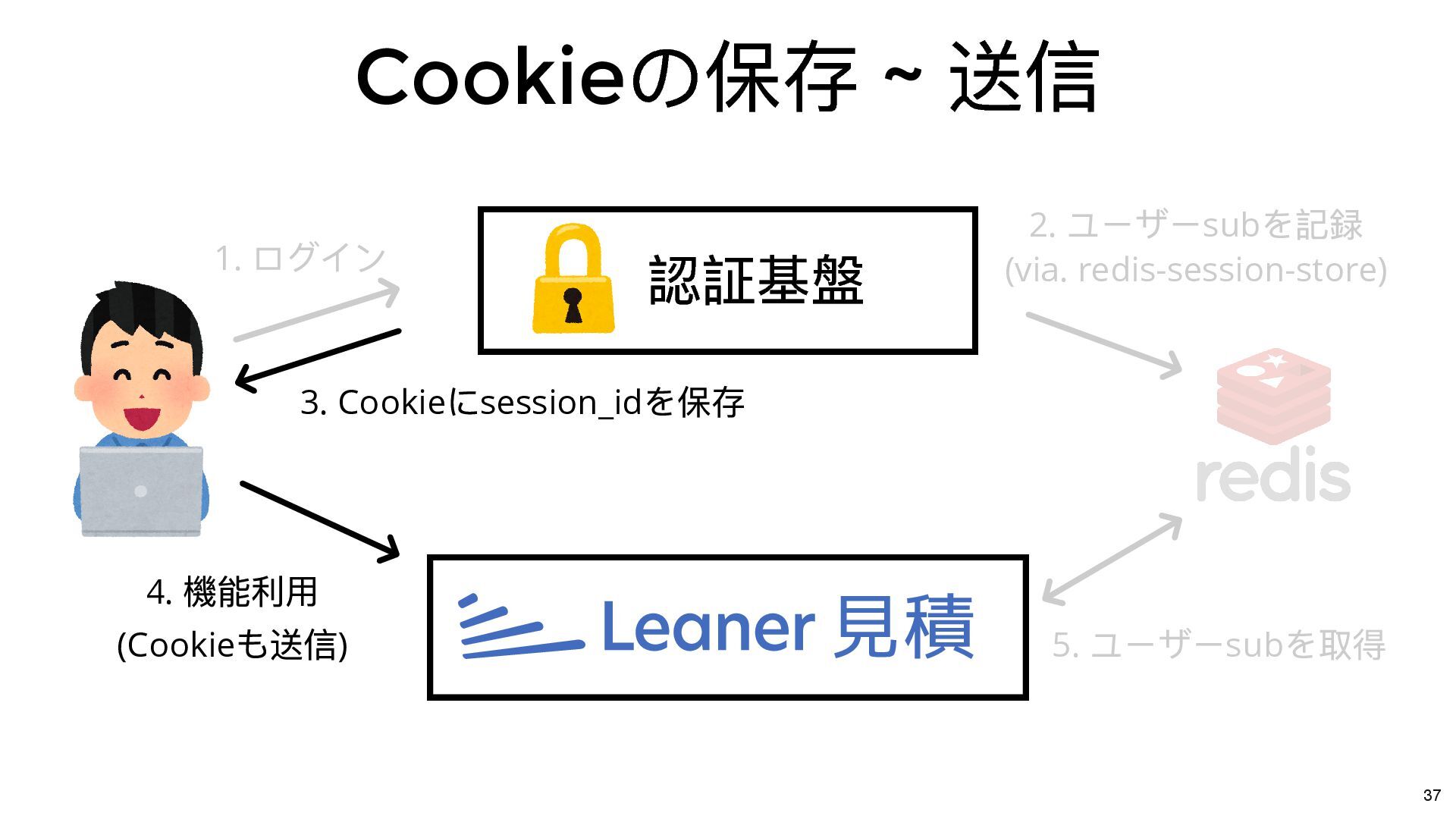 も送信) 2. ユーザーsub を記録 (via. redis-session-store) 3. Cookie にsession_id を保存 5. ユーザーsub を取得 37