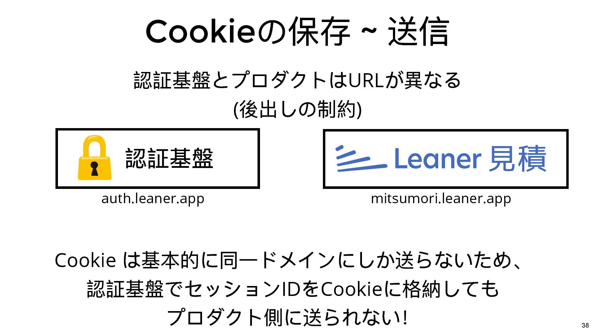 Cookie の保存 ~ 送信 認証基盤 auth.leaner.app mitsumori.leaner.app 認証基盤とプロダクトはURL が異なる (