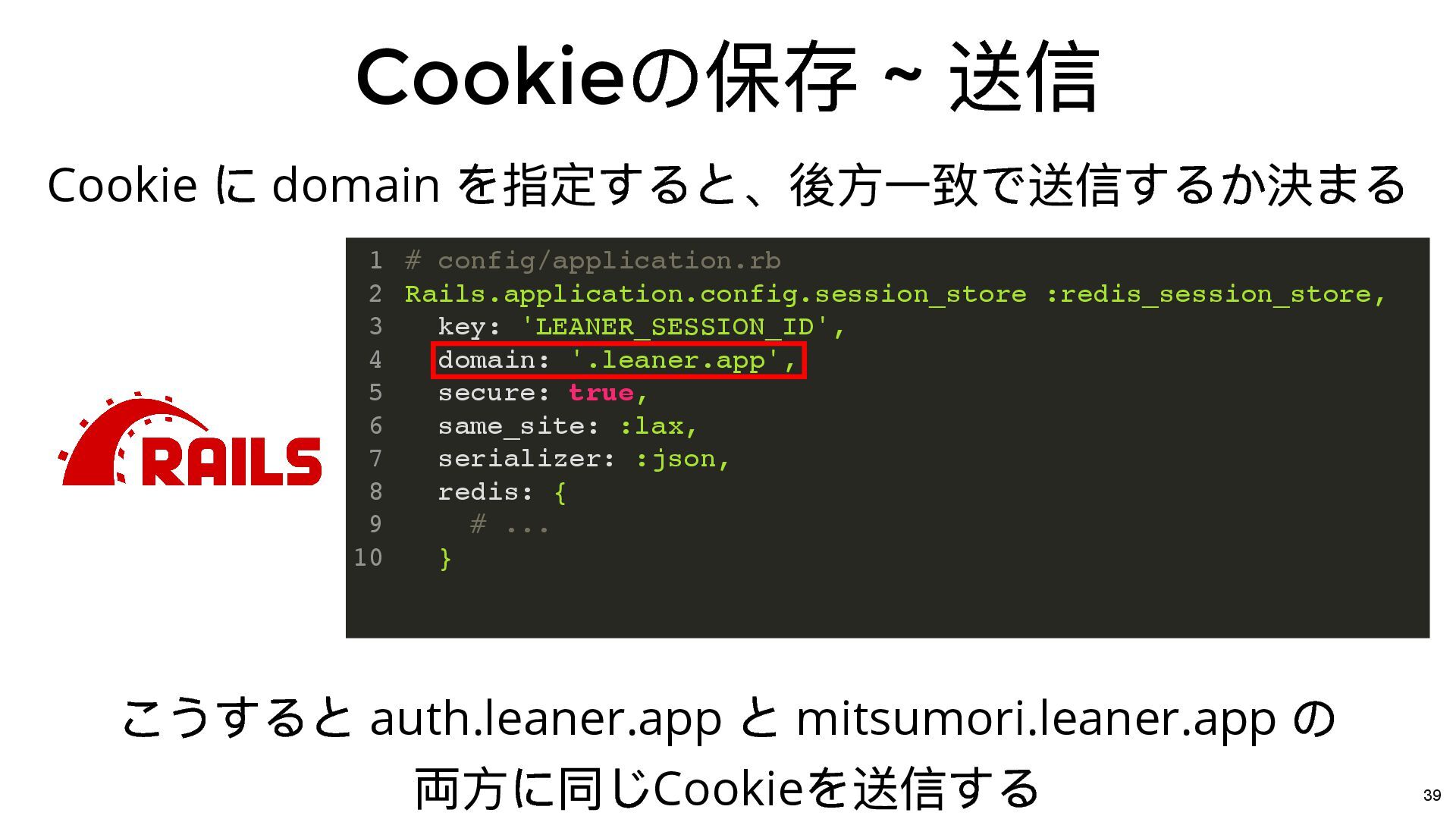 domain: '.leaner.app', secure: true, same_site: :lax, serializer: :json, redis: { # ... } 1 2 3 4 5 6 7 8 9 10 Cookie に domain を指定すると、後⽅⼀致で送信するか決まる こうすると auth.leaner.app と mitsumori.leaner.app の 両⽅に同じCookie を送信する 39