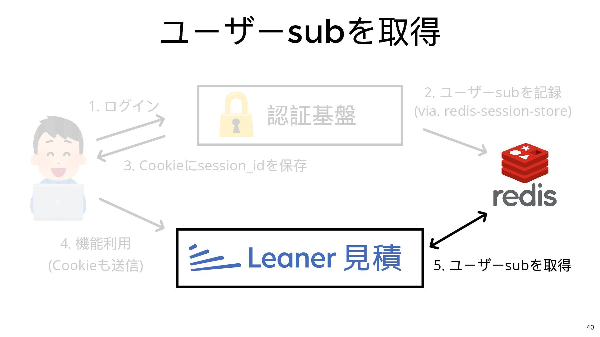 ユーザーsub を記録 (via. redis-session-store) 3. Cookie にsession_id を保存 5. ユーザーsub を取得 40