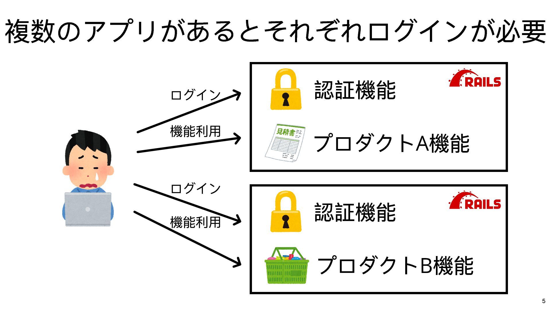 複数のアプリがあるとそれぞれログインが必要 認証機能 プロダクトA 機能 認証機能 プロダクトB 機能 ログイン 機能利⽤ ログイン