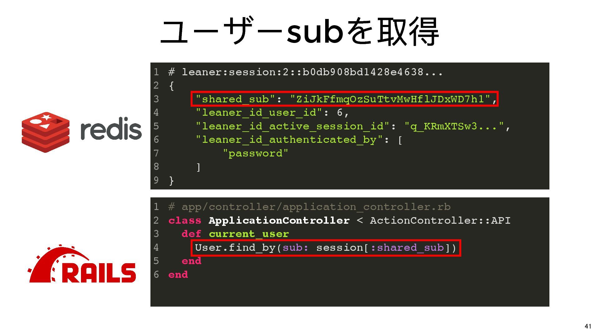 "q_KRmXTSw3...", "leaner_id_authenticated_by": [ "password" ] } 1 2 3 4 5 6 7 8 9 # app/controller/application_controller.rb class ApplicationController < ActionController::API def current_user User.find_by(sub: session[:shared_sub]) end end 1 2 3 4 5 6 41