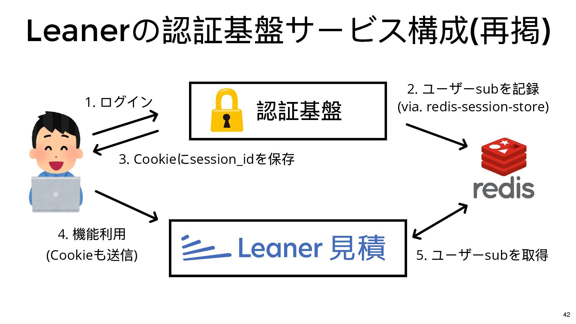 2. ユーザーsub を記録 (via. redis-session-store) 3. Cookie にsession_id を保存 5. ユーザーsub を取得 42