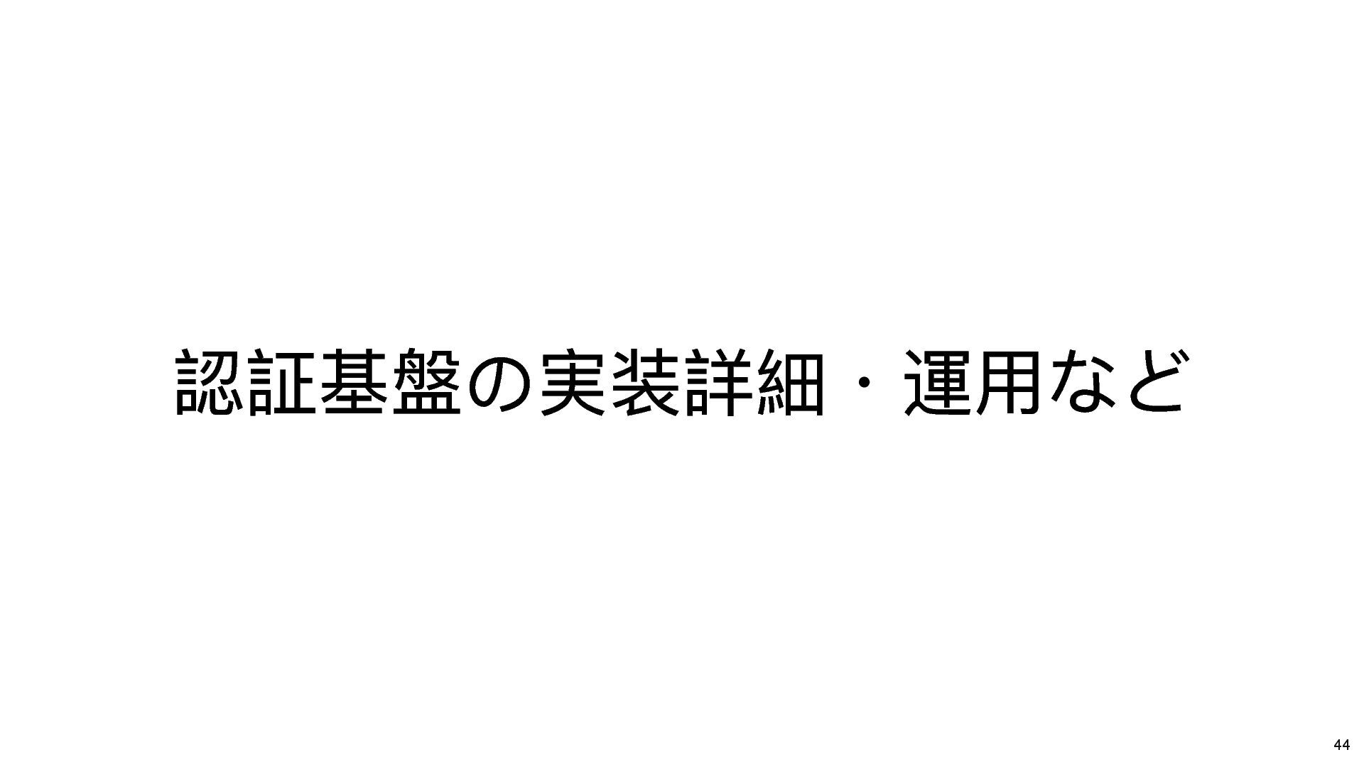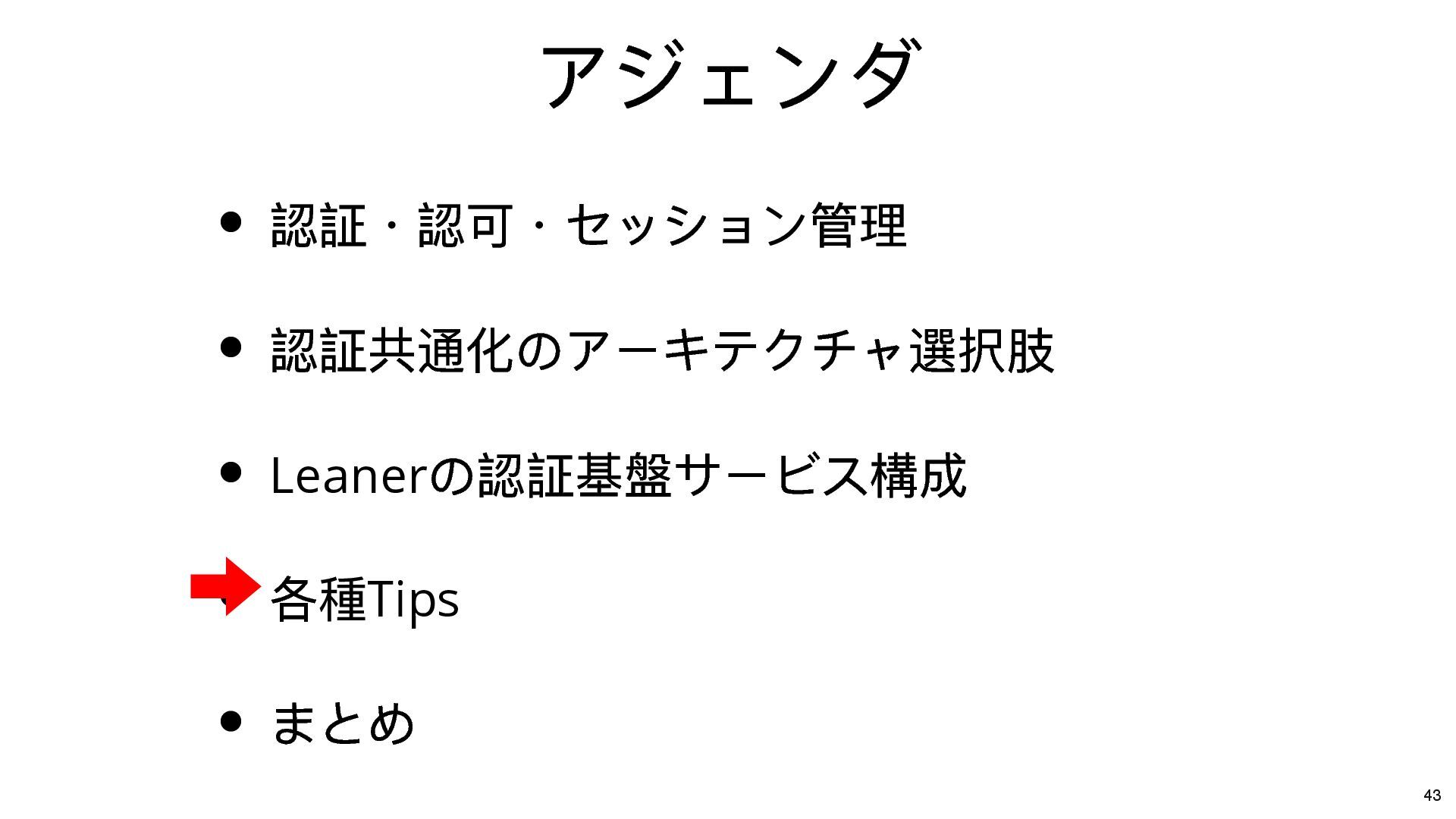 認証・認可・セッション管理 認証共通化のアーキテクチャ選択肢 Leaner の認証基盤サービス構成 各種Tips まとめ アジェンダ 43