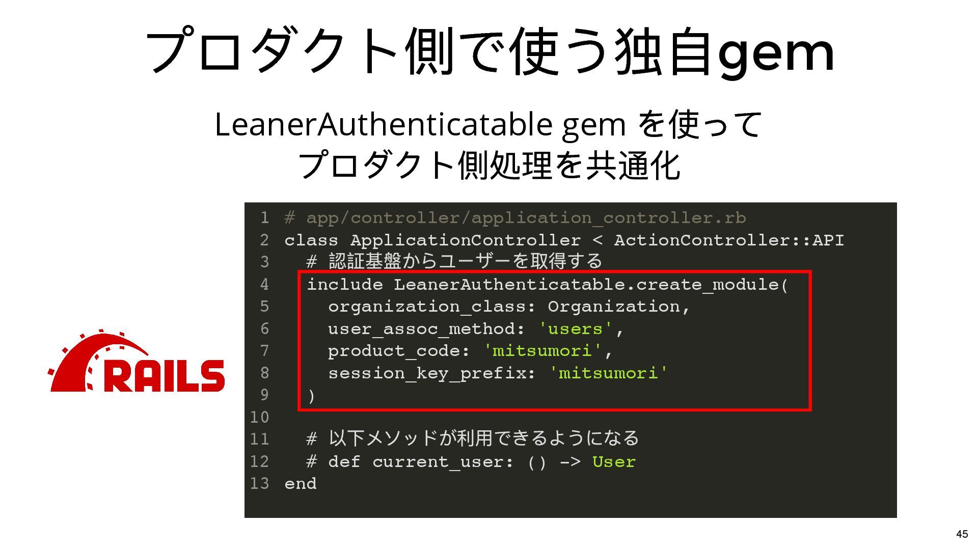 プロダクト側で使う独⾃gem LeanerAuthenticatable gem を使って プロダクト側処理を共通化 # app/controller/application_controller.rb class ApplicationController <